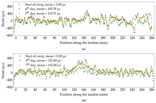 In these specific tests, the variability in strain data captured by the DFOS along the tendon’s free length does not appear to influence the overall creep strains of the CFRP tendon at any point in time. As such, the insights from DFOS strain data can help validate the robustness of the test set-up. It is nonetheless essential to examine the longitudinal distribution of strain data points from DFOS to distinguish natural material inhomogeneities from sensor-induced variability, such as debonding of the optical fibre from the tendon’s surface, inhomogeneities in the thickness of the adhesive between the fibre and the tendon, excessive bends in the optical fibre (minimal issue in the case of straight tendons in tension), and testing set-up failures such as excessive bending of the tendon in the loading frame. This discretion must be material and test-specific and educated decisions should be made to validate the distributed strain data before processing. This observation reinforces the importance of continuous measurements to capture sudden system failures, which is unfortunately not possible with DFOS systems due to the limited service life of the laser source (typically 25,000 h for a LUNA ODiSI DFOS as used in the current study).