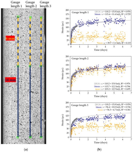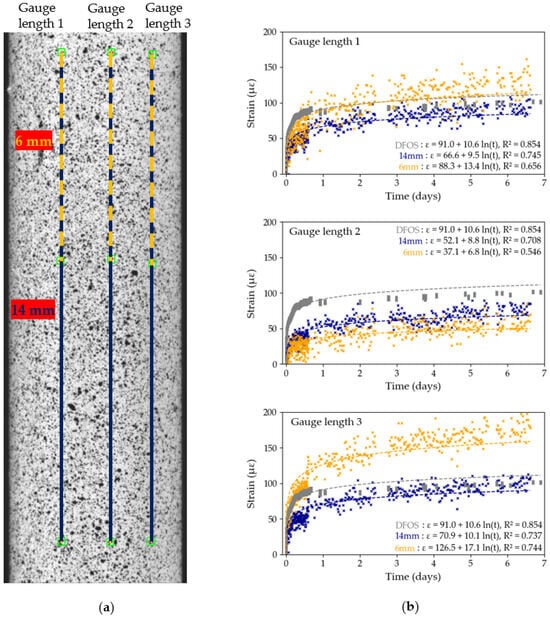 Test A1, DIC gauge length sensitivity study: (a) position of gauge lengths on the ROI; (b) strain recordings over time for full (14 mm) and short (6 mm) gauge lengths with logarithmic trendlines. The lack of DIC data between the second and the third day corresponds to an interruption in the DIC image capture system.