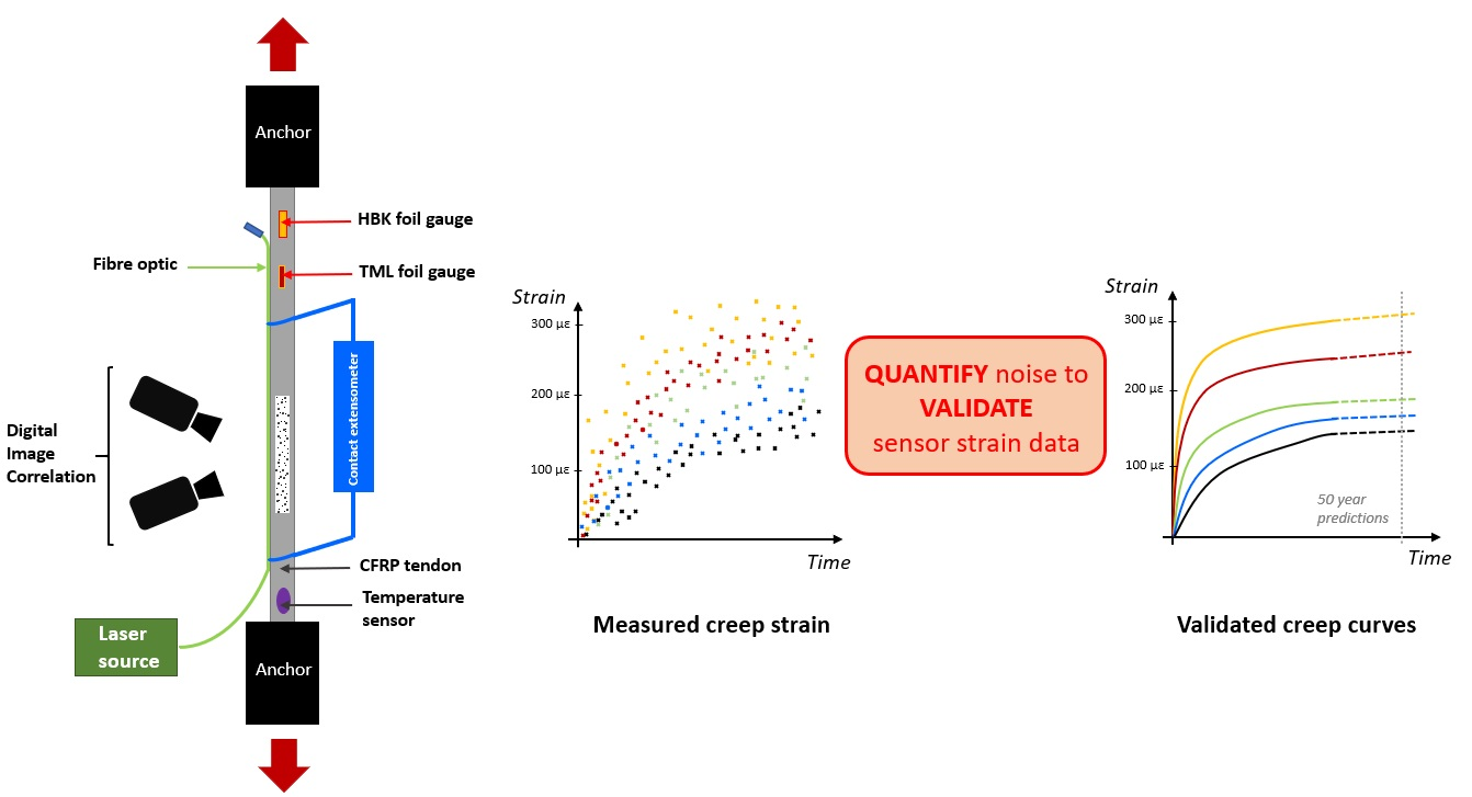- The HBK foil gauges either recorded a decrease in strain over time, which disagrees with the physical definition of creep, or underestimated the creep strains when compared to the other strain sensing techniques, demonstrating their inadequacy for measuring strain of CFRP tendons under high sustained loading conditions.