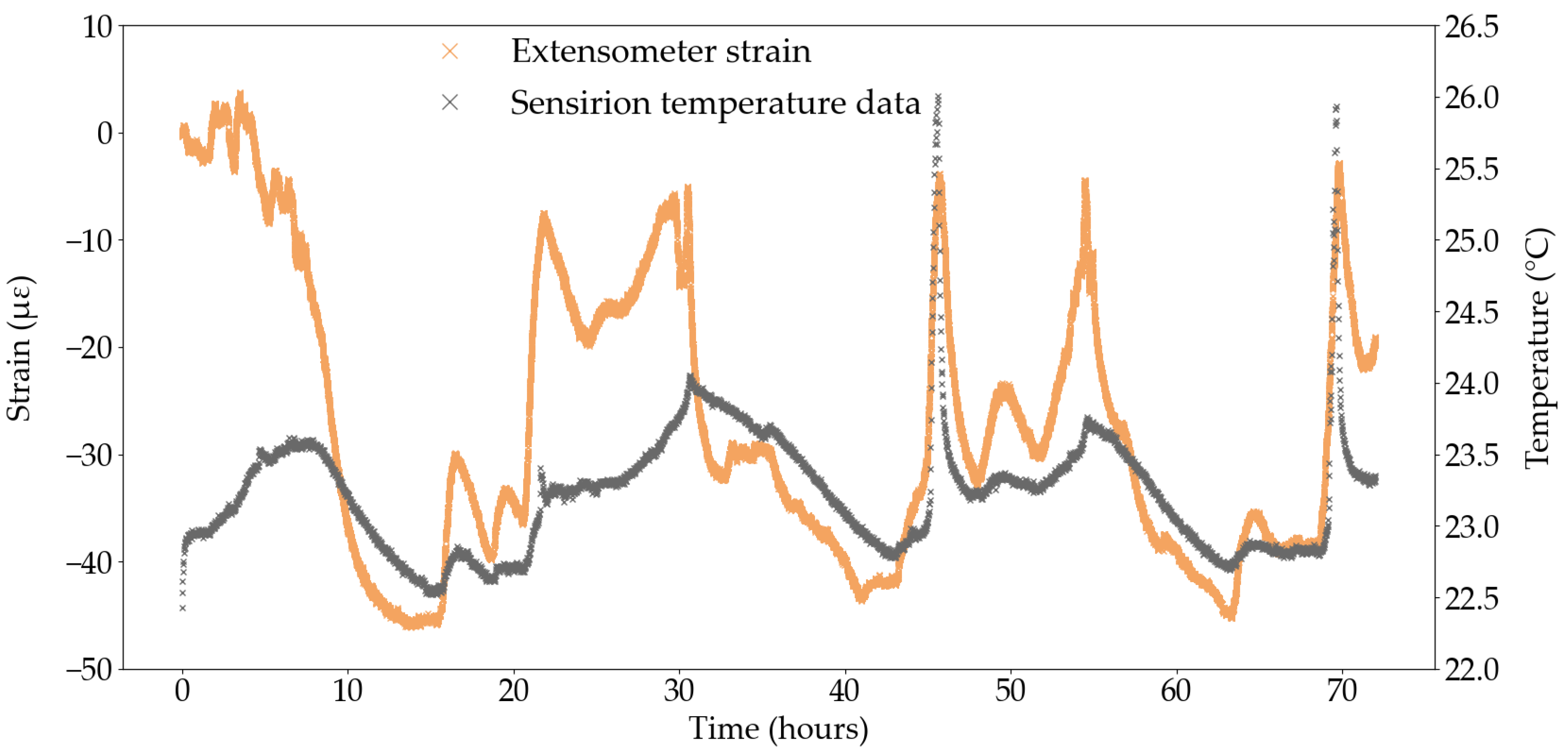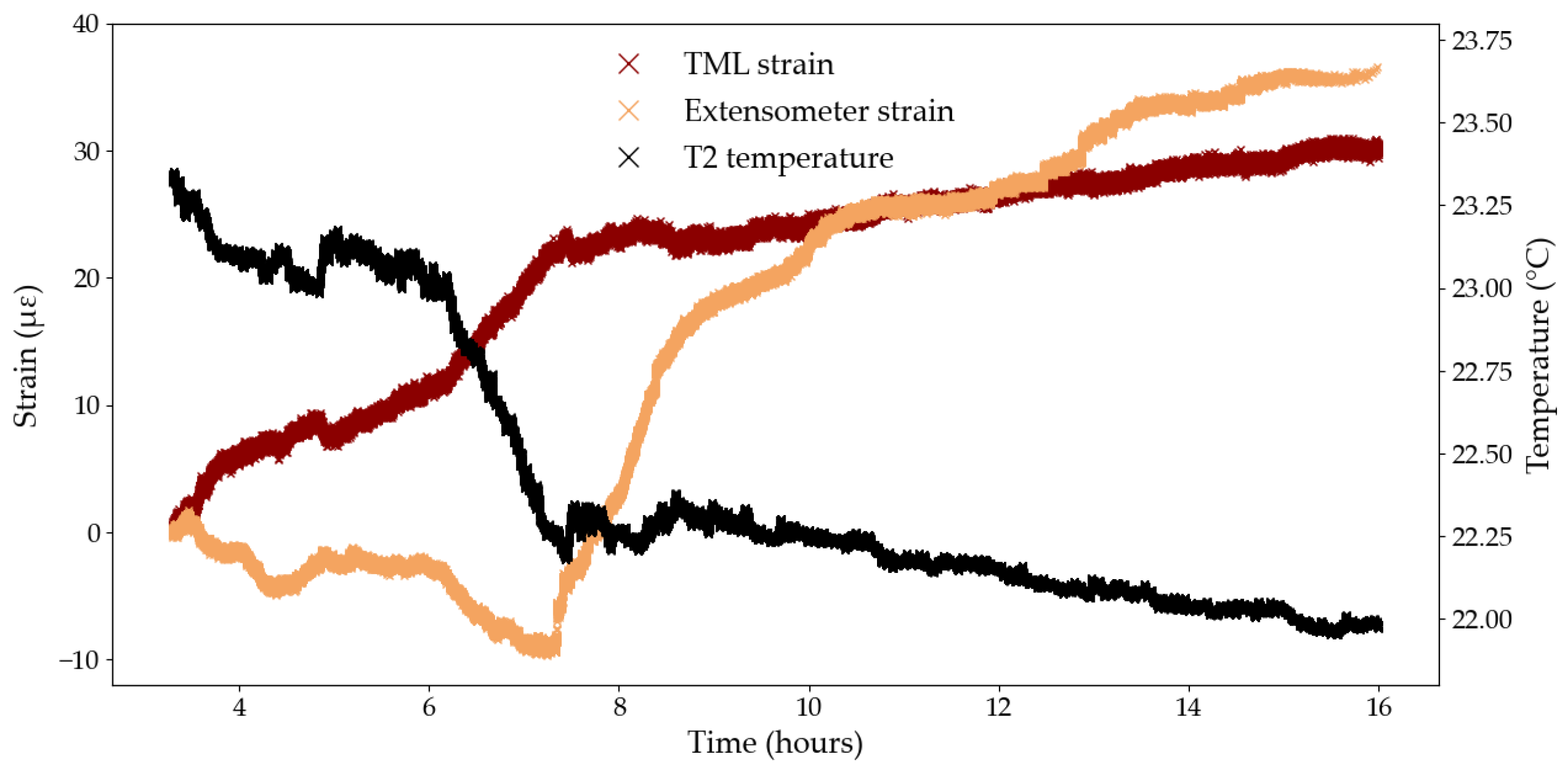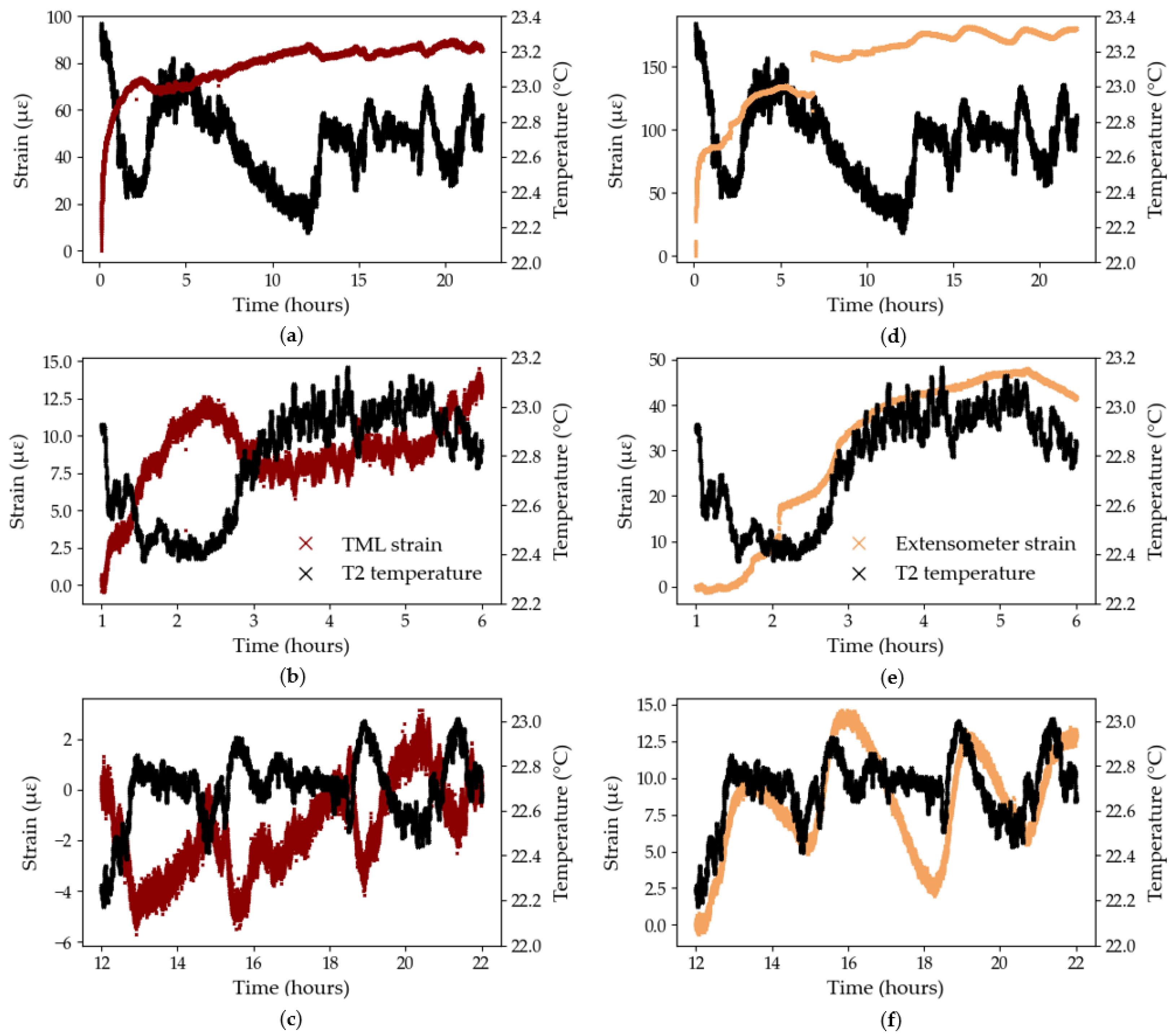 - The bonded TML strain gauge recorded a small and recoverable range of temperature-induced strains, consistently 12 με/°C, while the response of the extensometer to temperature changes varied in phase and magnitude, with a maximum reported CTE of 40 με/°C.