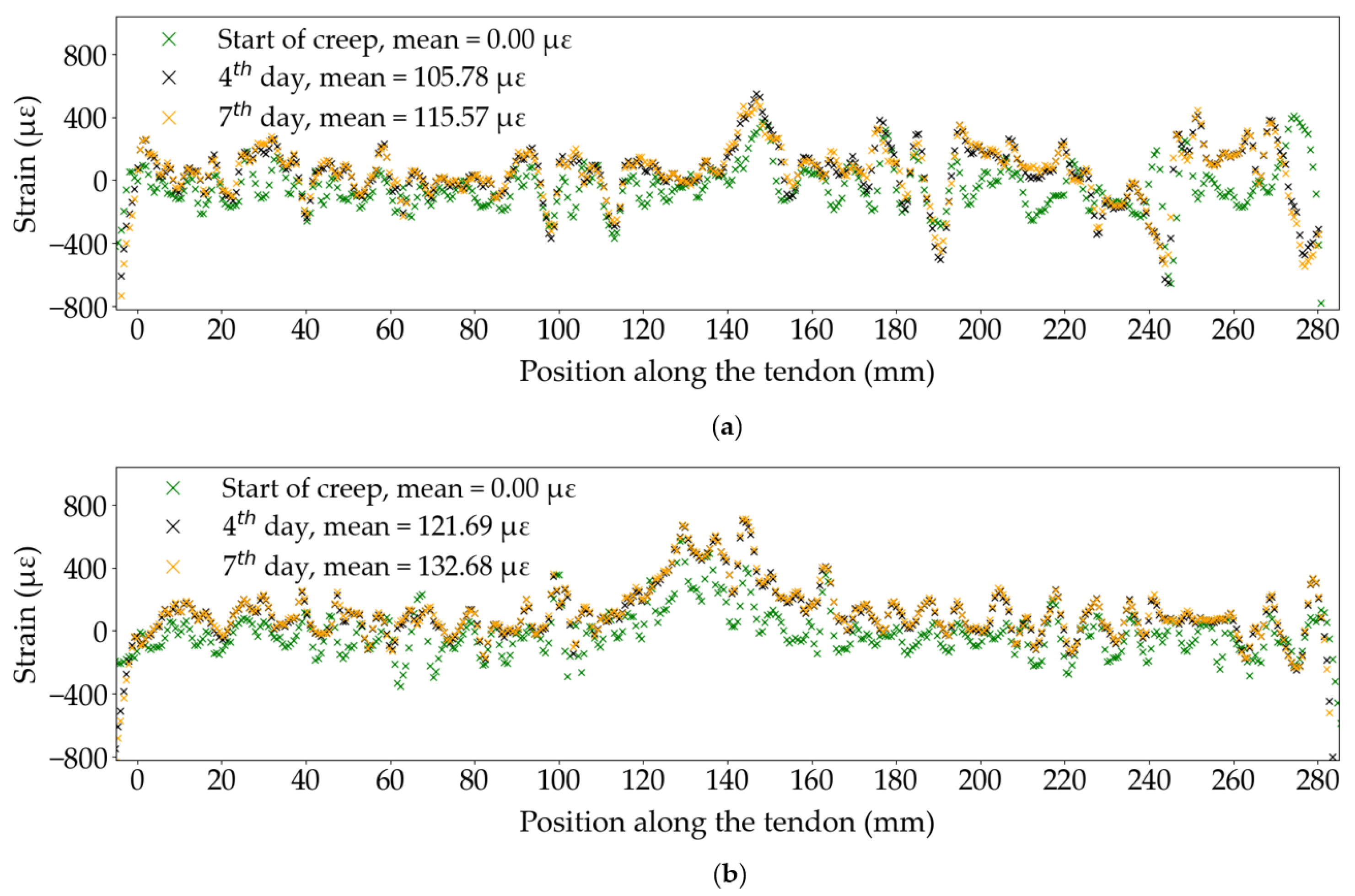 - The DFOS recorded localised peaks of 150% of the averaged measured strain at the tendon’s mid length; however, these localised strain peaks had no significant influence on the overall creep behaviour of the CFRP tendons.