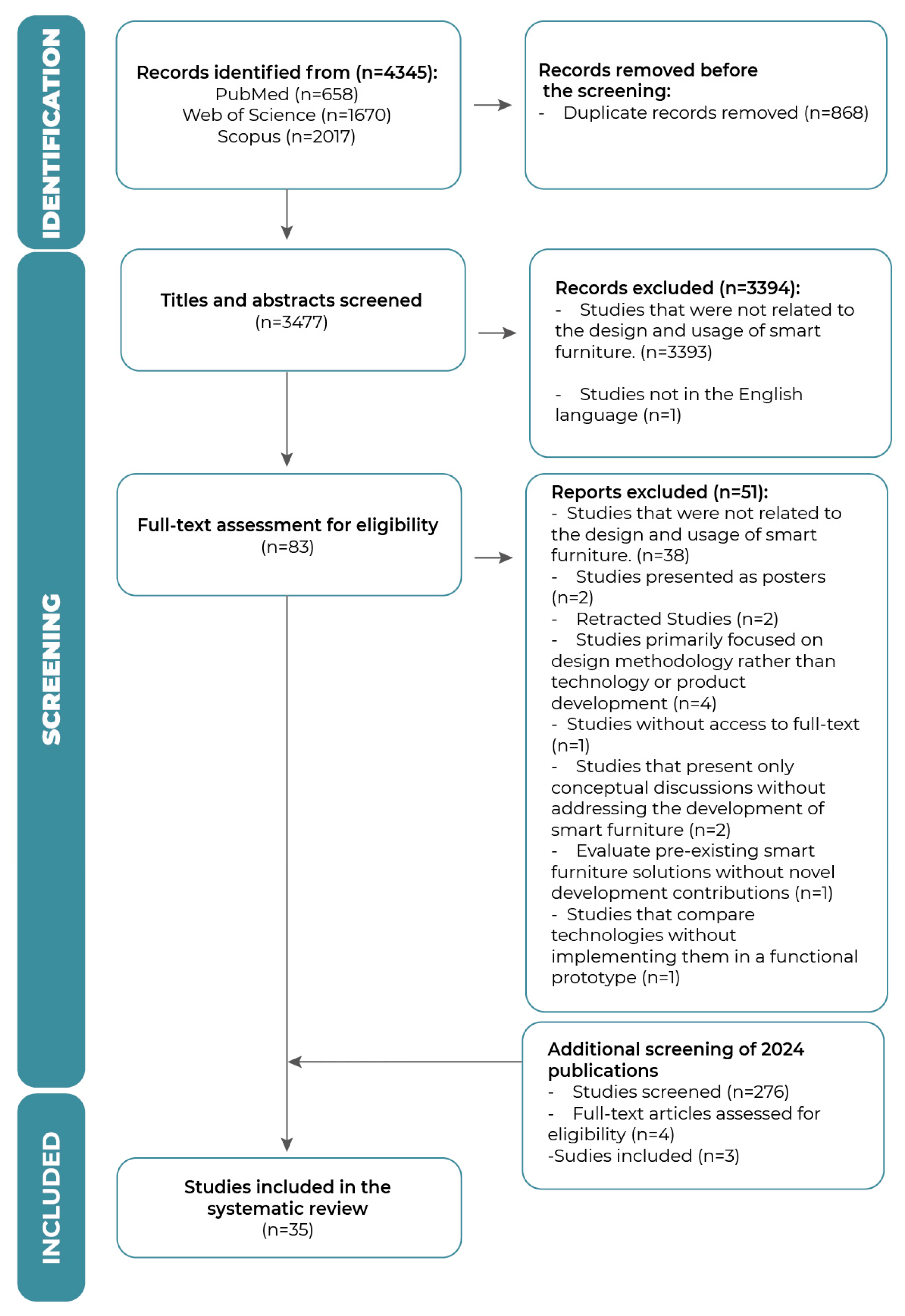| Prototype Development | Describes the development and/or validation of a smart furniture prototype/system | Studies that only compare technologies or evaluate existing solutions without novelty |