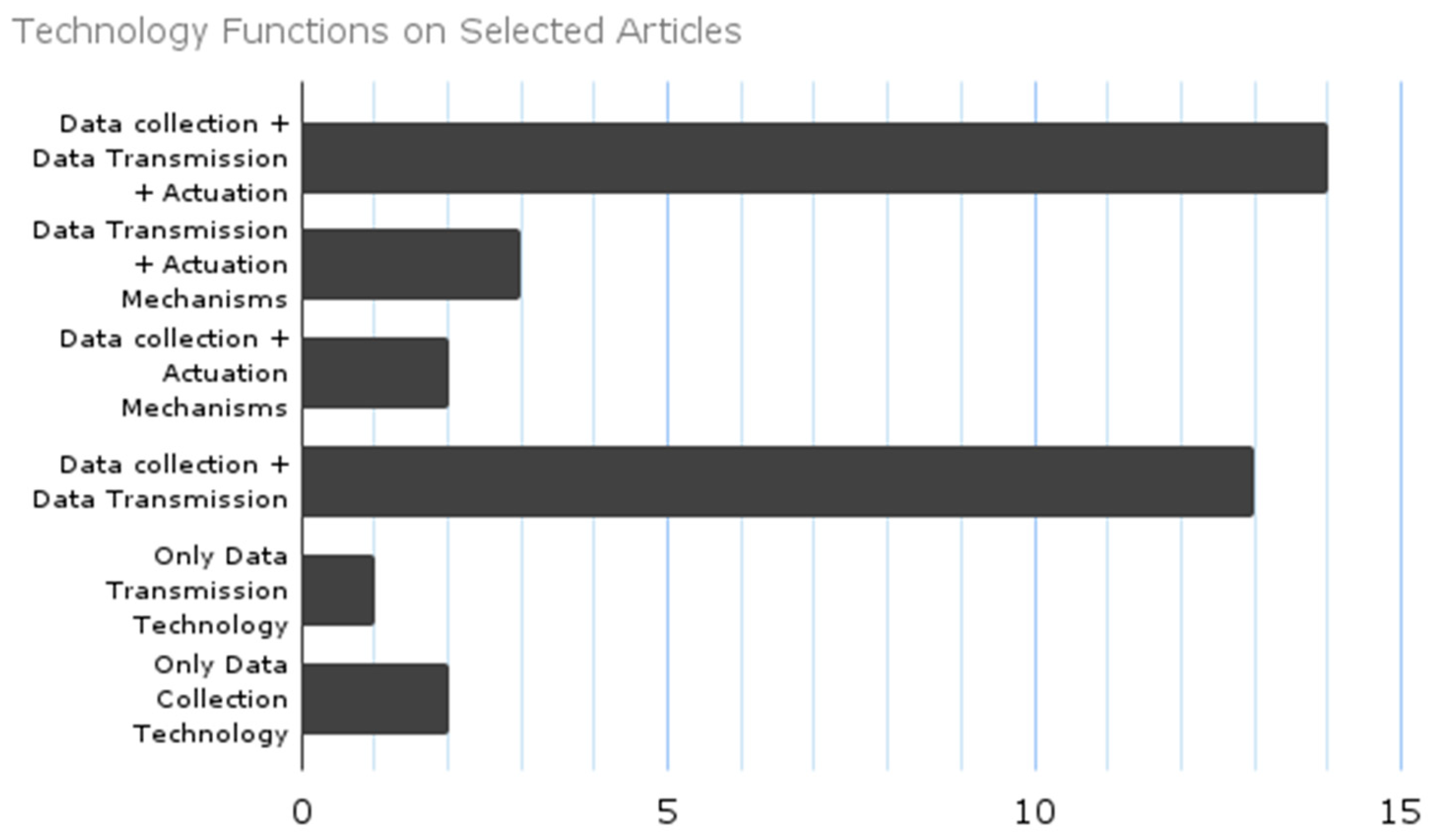 | [17] | Bed, an armchair and a bedside table | Wireless Sensor Networks (WSN) Zigbee modules Microcontrollers Wireless node Load cells Accelerometers Moisture sensor Magnetic contact sensor Infrared temperature Infrared distance sensors Motor actuators Presence sensor Light sensor | Data collection, Process/transmit information, Execute physical/digital actions | Targeted to older people, Health and well-being |