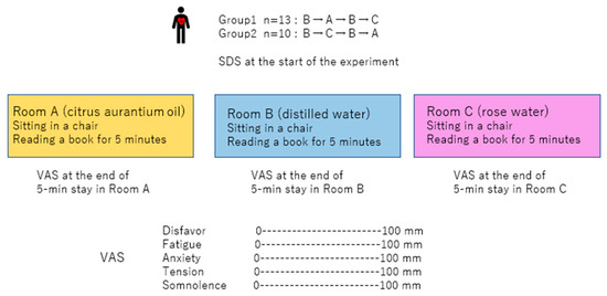 Each participant stayed alone in each room for 5 min, sitting on a chair in front of the table where the diffuser was situated, and was instructed to read a book. The participants were not informed of the substance inside the diffuser (citrus aurantium oil, rosewater, or distilled water). A 2 min transfer and washout period outside the experimental room was implemented before the participants entered the next room. During this period, the participants were instructed to report the content of the book to the experimenter, confirming that they maintained arousal during the experiment, and complete the visual analog scale (VAS) to determine the feelings—including disfavor, fatigue, anxiety, tension, and somnolence during—they experienced during their stay (Figure 1). Disfavor corresponds to an unfavorable feeling regarding the air in the room. In addition, a questionnaire, the Self-rating Depression Scale (SDS), was completed at the start of the experiment to assess the mental state of each participant [23].