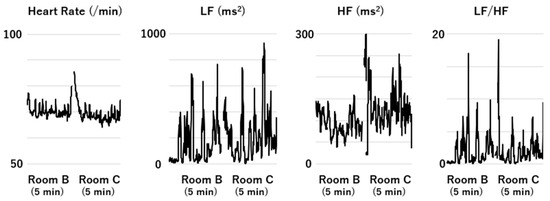 Heart rate (HR) and heart rate variability (HRV) data for a participant during their stay in Room B (distilled water) followed by those obtained during their stay in Room C (rose water). A two-minute transfer and washout period took place between these two stays. The data on the HRV and HR parameters for the period from 30 s after entry to the end of the stay were averaged for each stay to avoid the effects of the stay outside the experimental room. HR is expressed as heartbeats per minute (/min).
