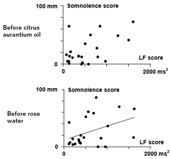 Relationship between somnolence VAS scores and LF in Room B (distilled water) before the citrus aurantium oil and rose water treatments. Filled circles represent individual data. A correlation was found between the somnolence VAS score and LF in Room B before the rose water treatment (r = 0.426, p = 0.043). No correlations were found during the rose water treatment (r = 0.357, p = 0.094).