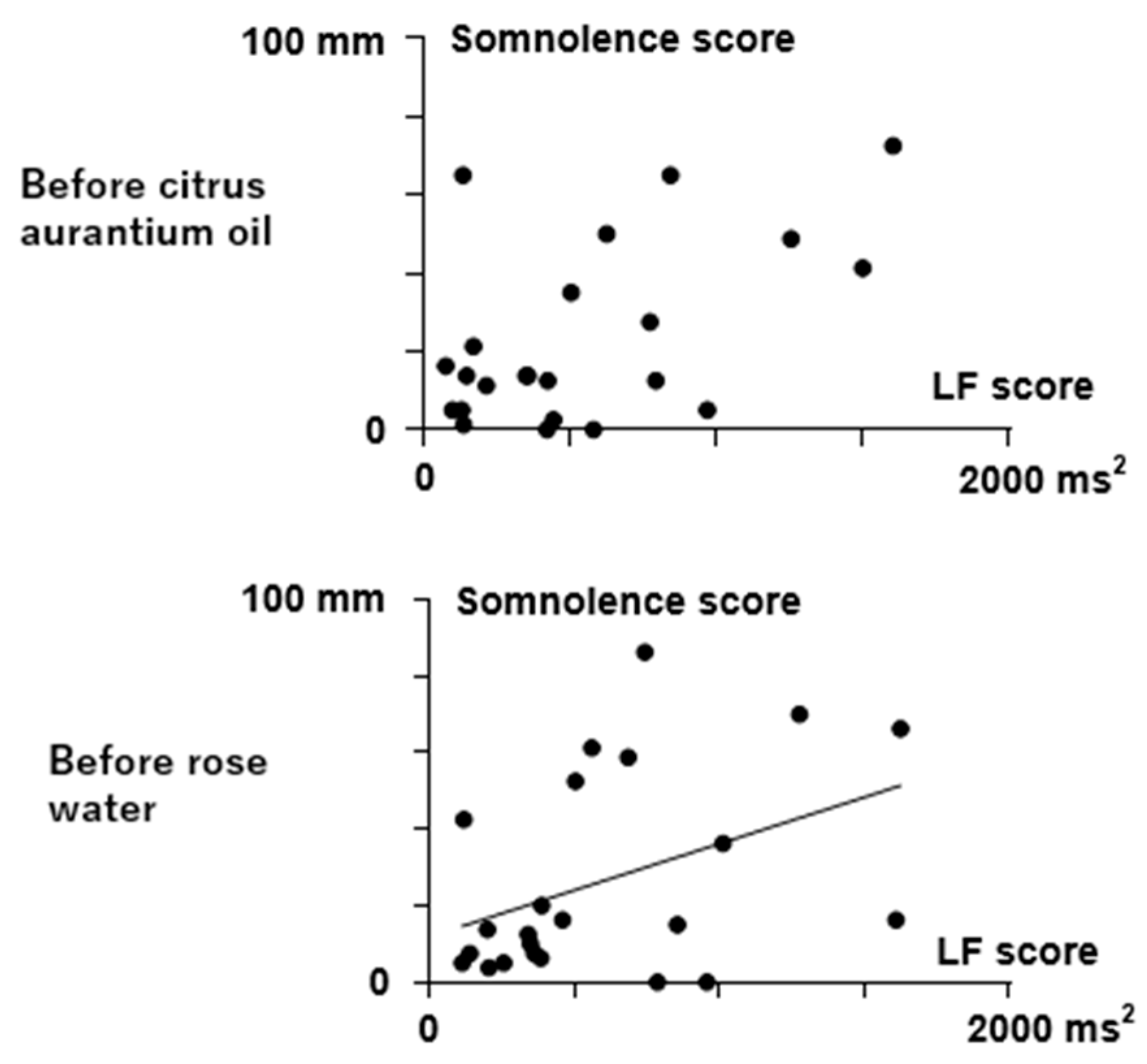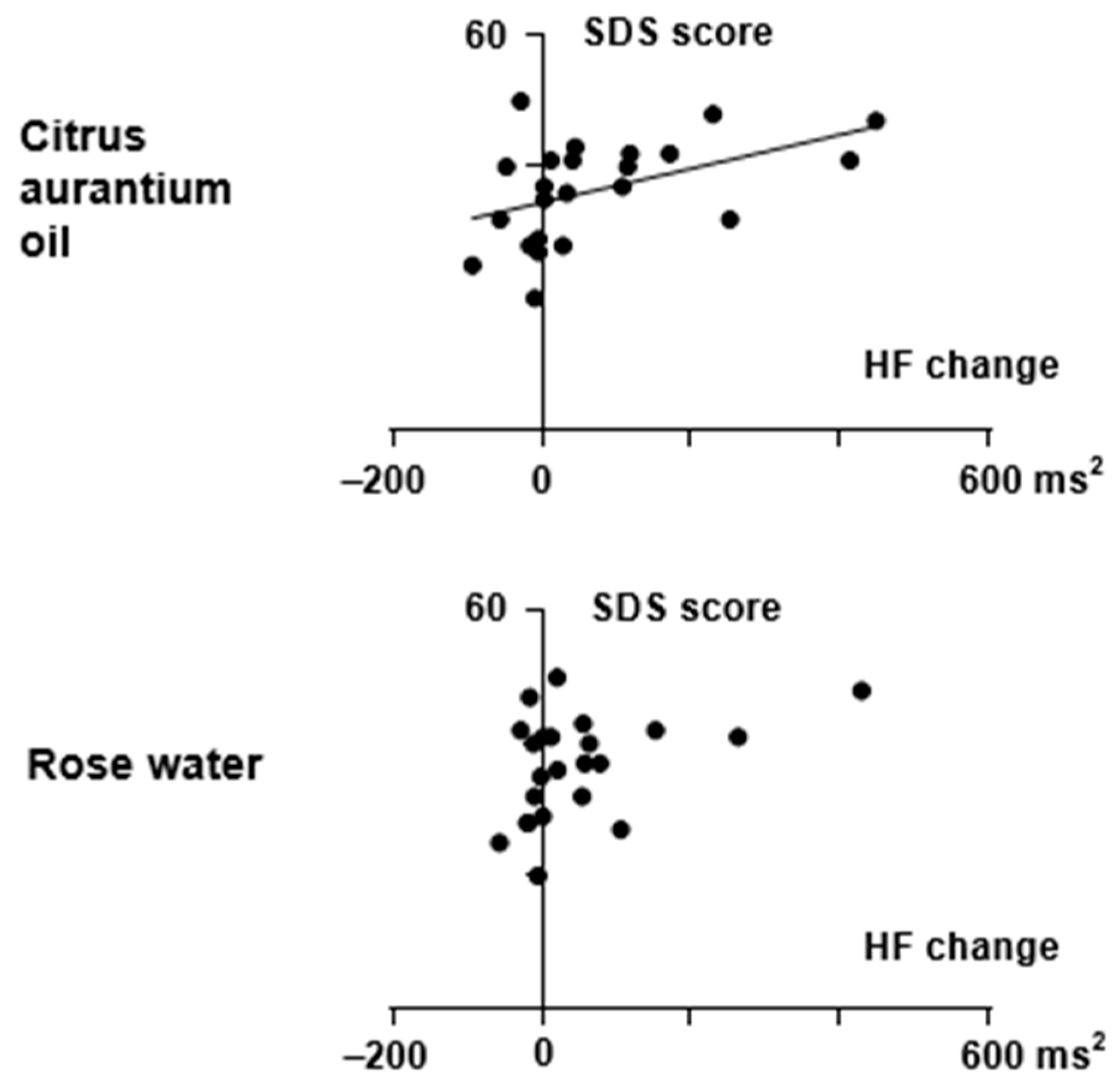3.3. Different Relationships Between Autonomic Modulation and VAS/SDS Scores in Citrus Aurantium Oil and Rose Water Treatments