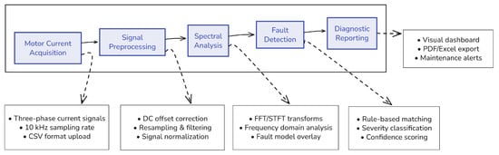 PumpSpectra was designed as a modular diagnostic platform that integrates data acquisition, signal processing, fault detection, and reporting into a transparent and user-friendly framework. The architecture follows a sequential workflow, from current signal upload to final fault diagnosis, ensuring accessibility for technicians while maintaining analytical rigor for engineers and researchers.