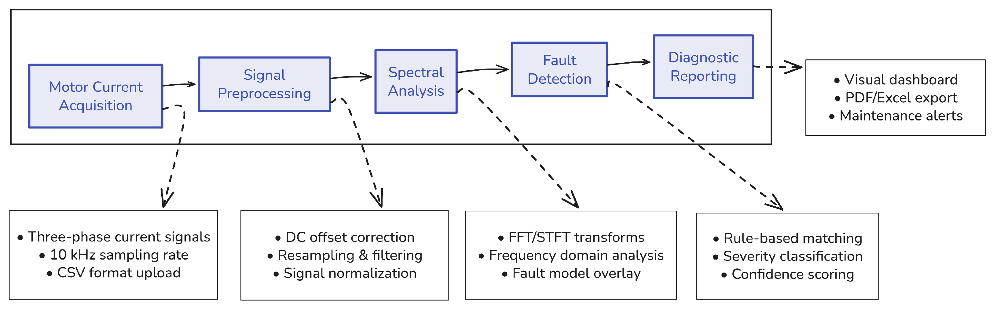 Signal Acquisition and Preprocessing: Raw stator current signals are uploaded in CSV format, cleaned, and resampled to meet diagnostic requirements.