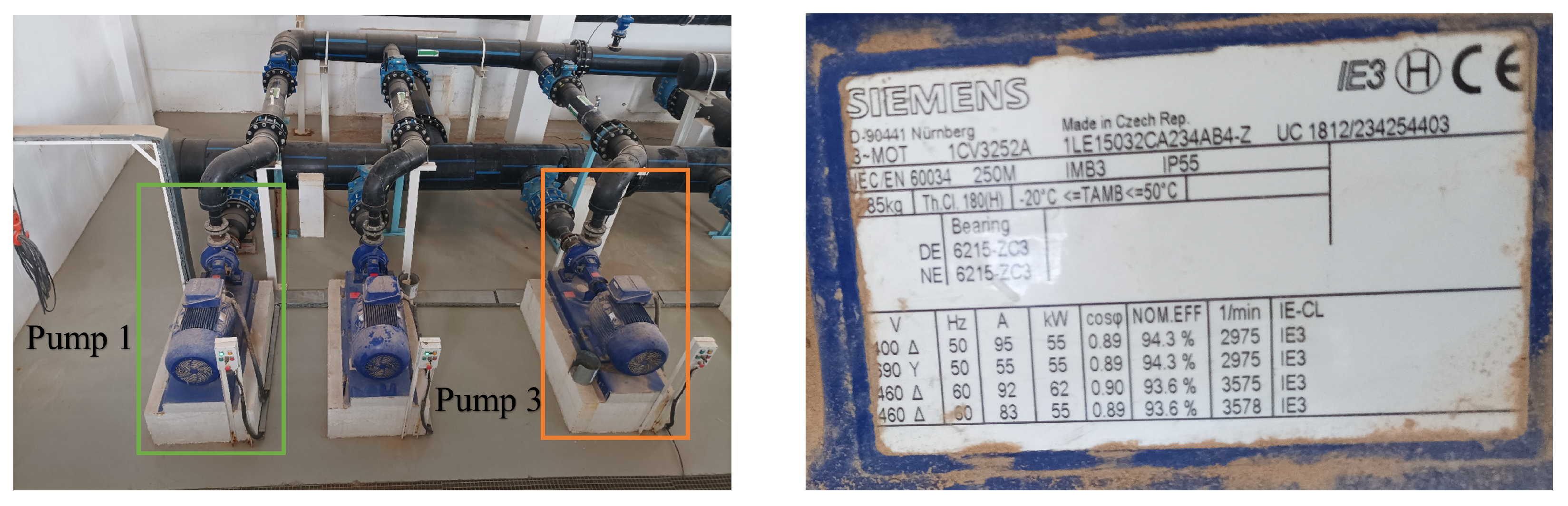 El Oued pumping line used for tests (left), and Siemens IE3 motor nameplate (right).