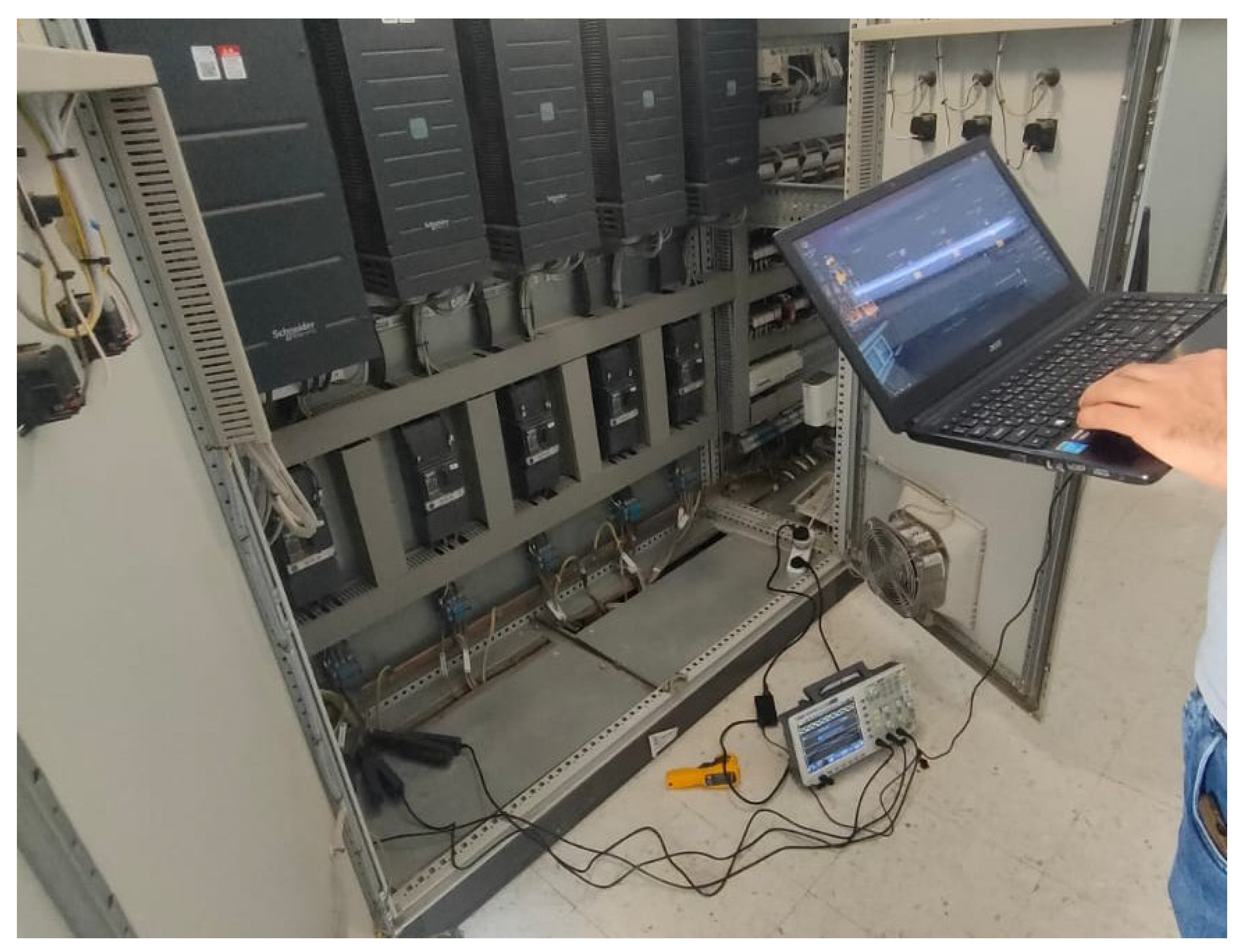On-site acquisition: oscilloscope connected at the MCC. Three-phase stator currents were acquired at 50 kHz for 10 s.