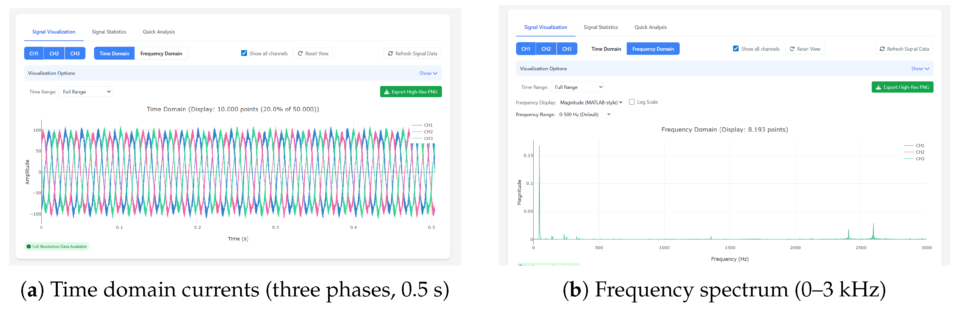User Interaction and Reporting: Diagnostic results are presented through a dual-mode web interface, offering simplified outputs for technicians and detailed spectral views for engineers. Reports can be exported in PDF, Excel, or JSON format for integration with maintenance systems.