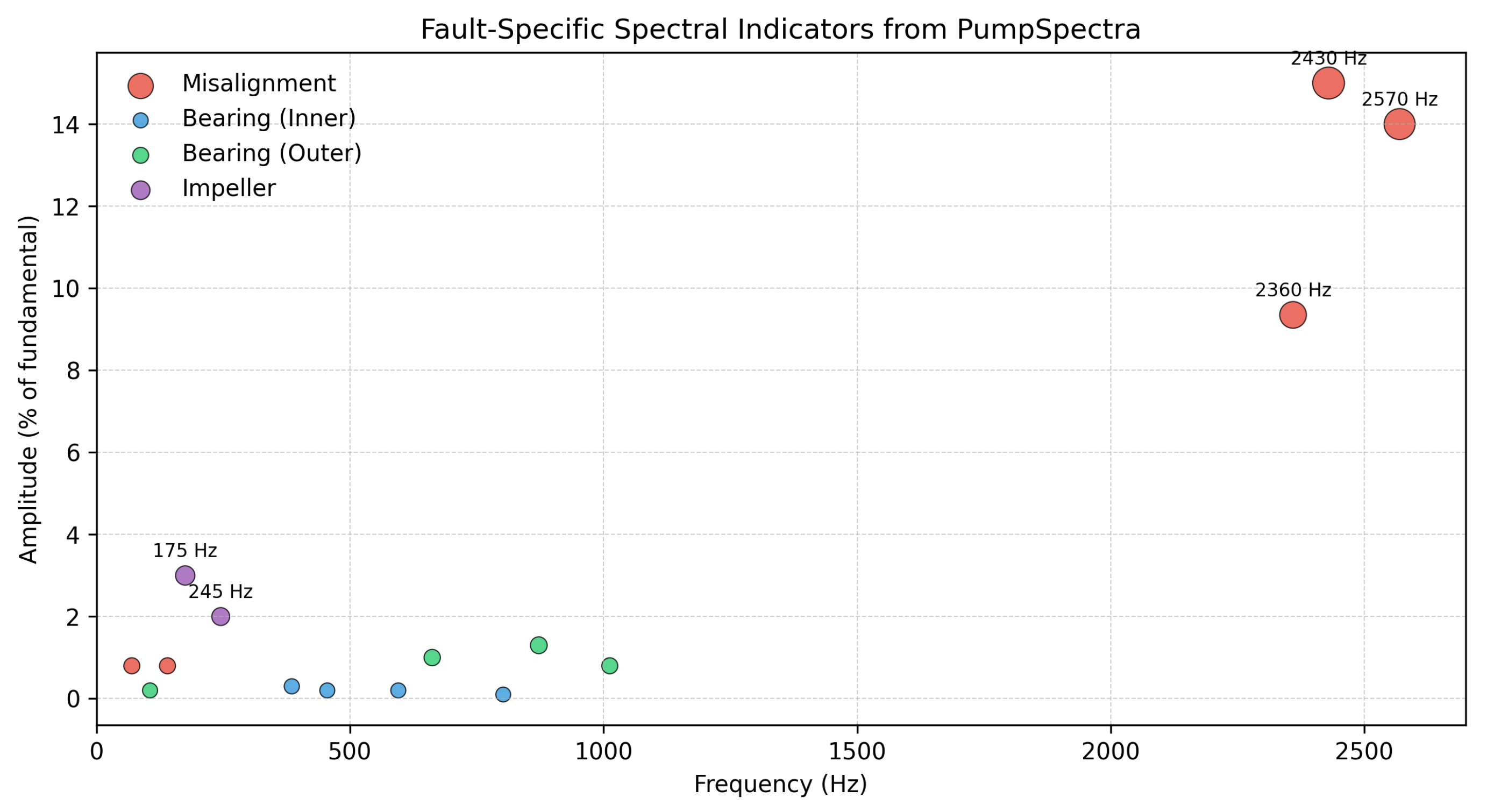Fault-specific spectral indicators from PumpSpectra analysis showing detected fault signatures across the frequency spectrum.