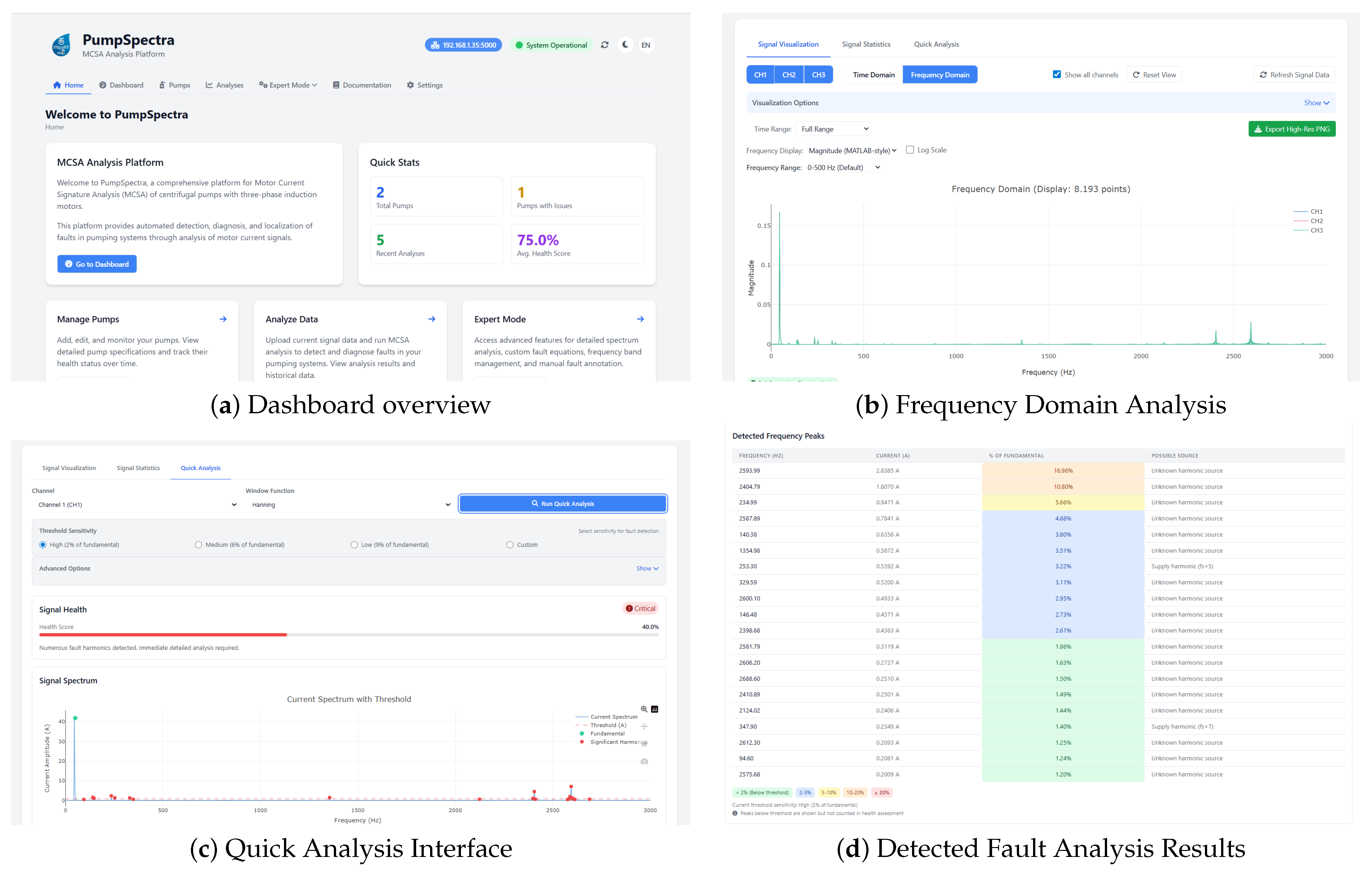 PumpSpectra user interface and analysis capabilities: (a) main dashboard showing system overview, (b) advanced frequency domain analysis, (c) quick analysis interface for rapid fault assessment, and (d) comprehensive fault analysis results with severity assessment.
