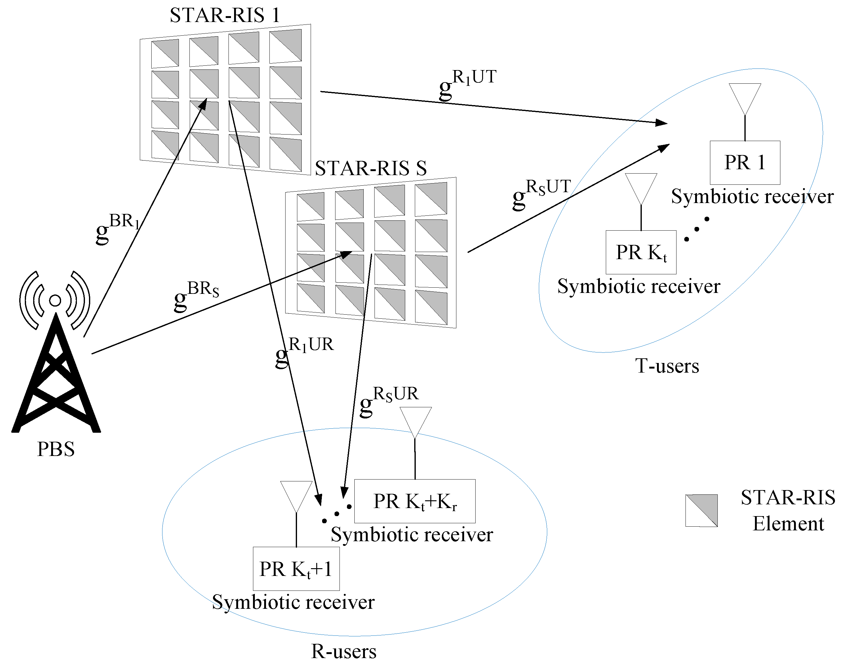- Yeganeh, R.S.; Omidi, M.J.; Zeinali, F.; Mili, M.R.; Ghavami, M. QoS Improvement in Multi User Cellular-Symbiotic Radio Network Assisted by Active-Star-RIS. IEEE Trans. Cogn. Commun. Netw. 2025. early access. [Google Scholar] [CrossRef]