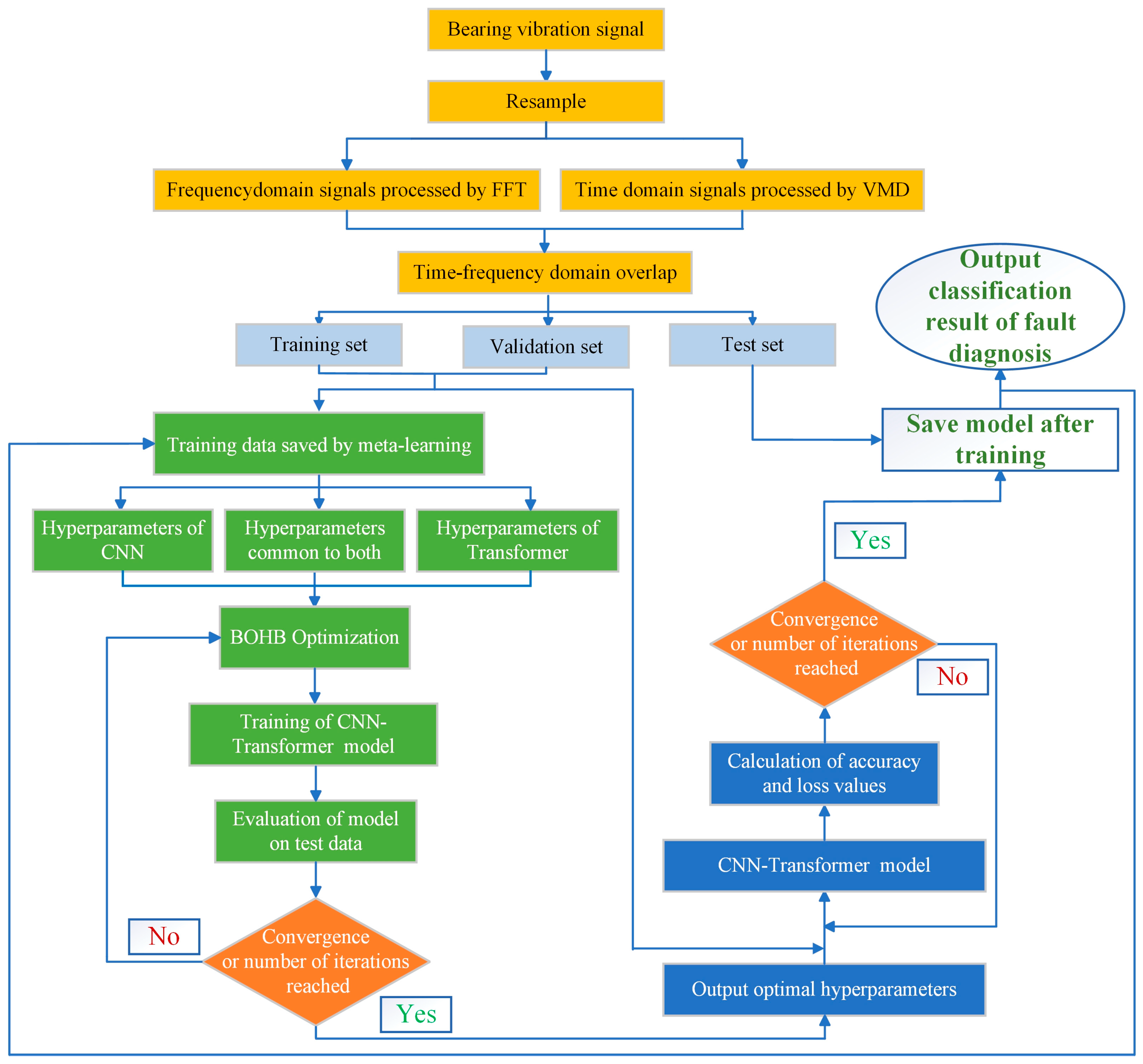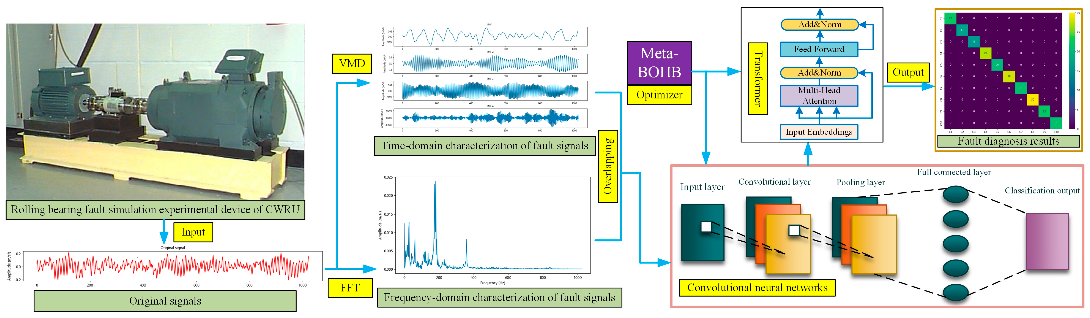 Figure 2. This workflow, from signal acquisition to classification output, demonstrates how the integration of VMD, FFT, CNN, Transformer, and Meta-BOHB optimization enables accurate and efficient diagnosis of rolling bearing faults. The detailed process flow is illustrated in