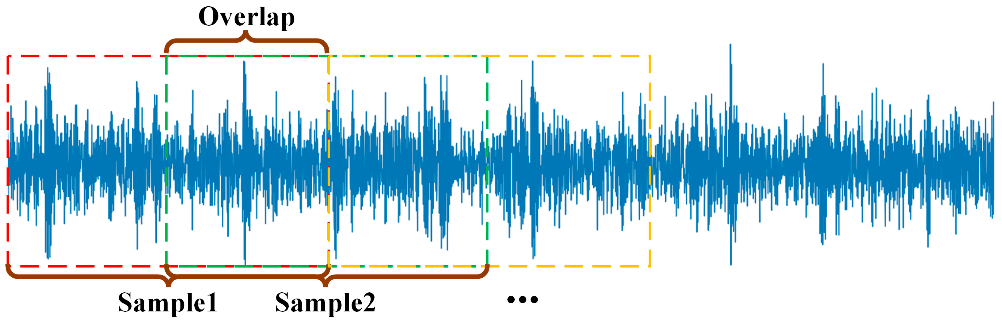 Due to the limited quantity of samples in the original CWRU database, a comprehensive evaluation of the parallel computational capabilities of the developed diagnostic approach presented challenges. To address this limitation, an overlapping segmentation strategy was implemented for data augmentation of the vibration recordings, as illustrated in