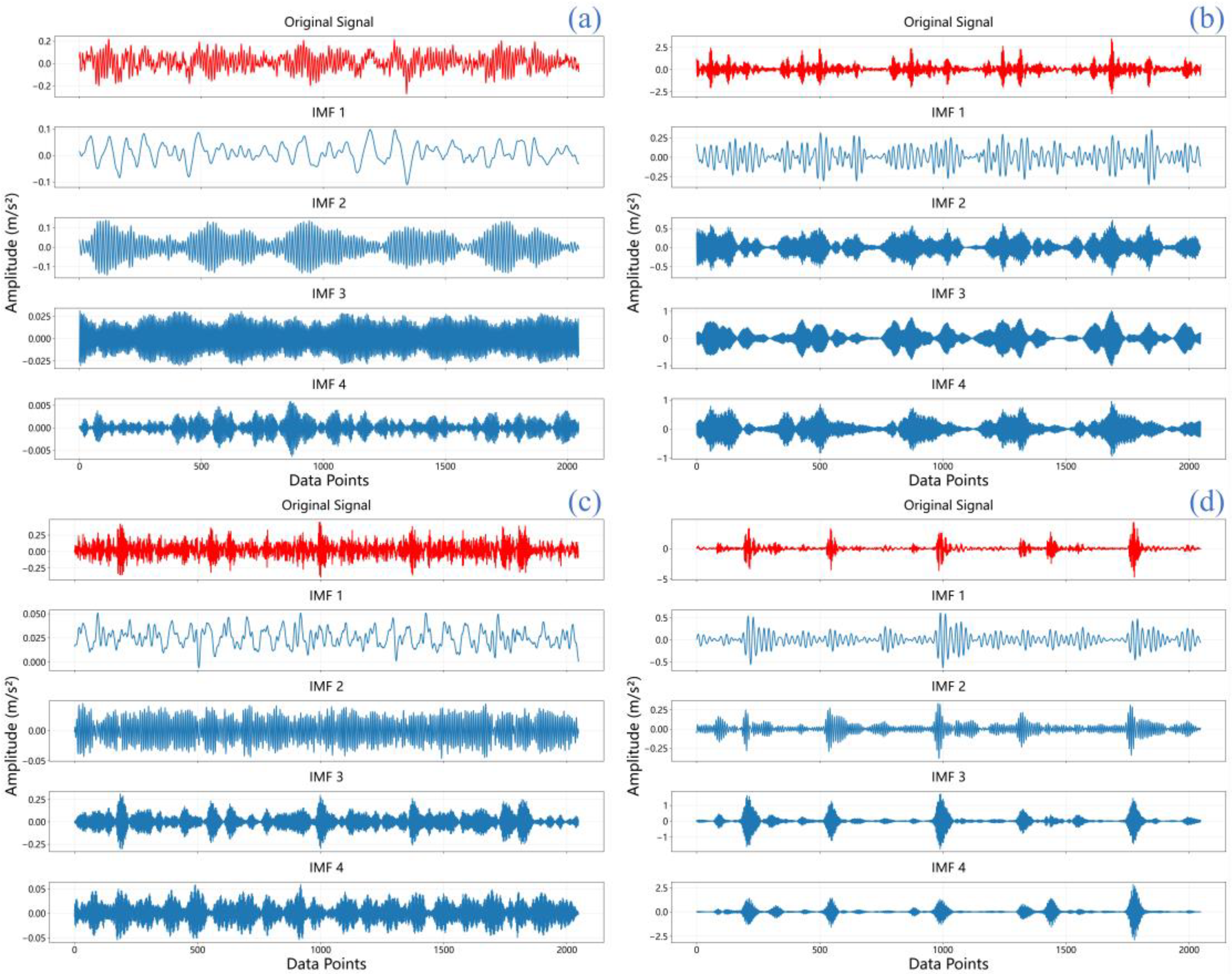 In this research, raw vibration signals undergo processing through VMD and are separated into four IMFs for subsequent examination. These IMFs (IMF1-IMF4) represent distinct oscillatory modes extracted from the original signal, each capturing different frequency components and temporal characteristics that are crucial for fault feature identification. As shown in
