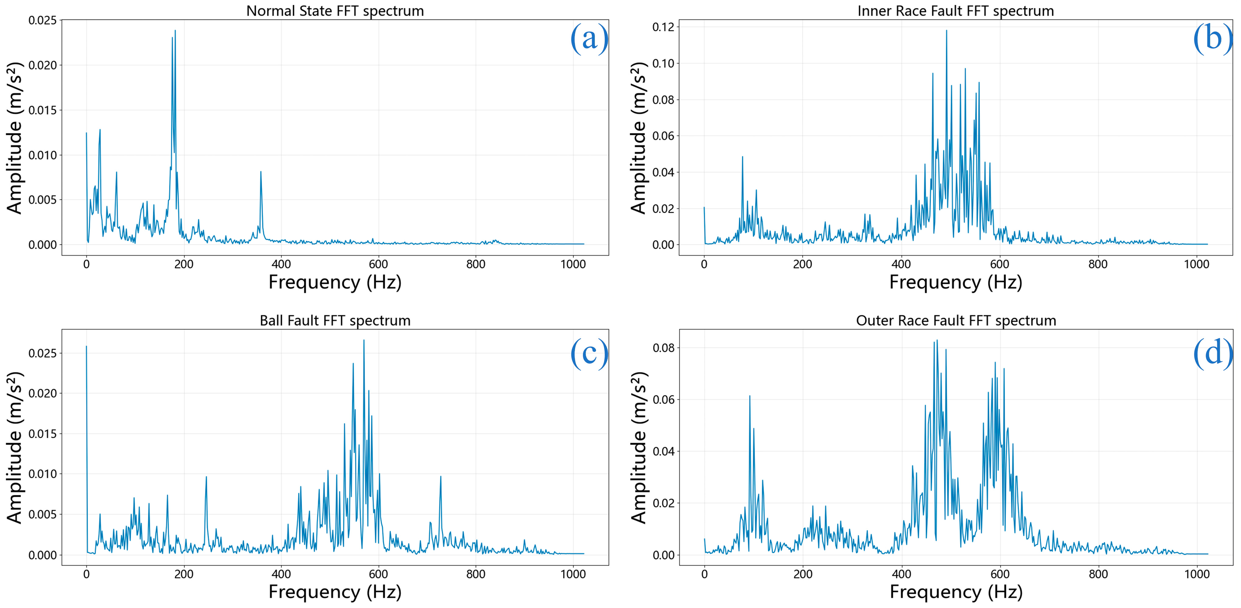 37]. The FFT spectra reveal how the vibration energy varies across different frequencies, assisting in the identification of potential harmonics and irregularities within the vibration data. Differences in the frequency spectra across fault conditions can provide valuable insights for fault identification and diagnosis, enhancing our understanding of the bearing’s operational state and aiding in more effective monitoring.
