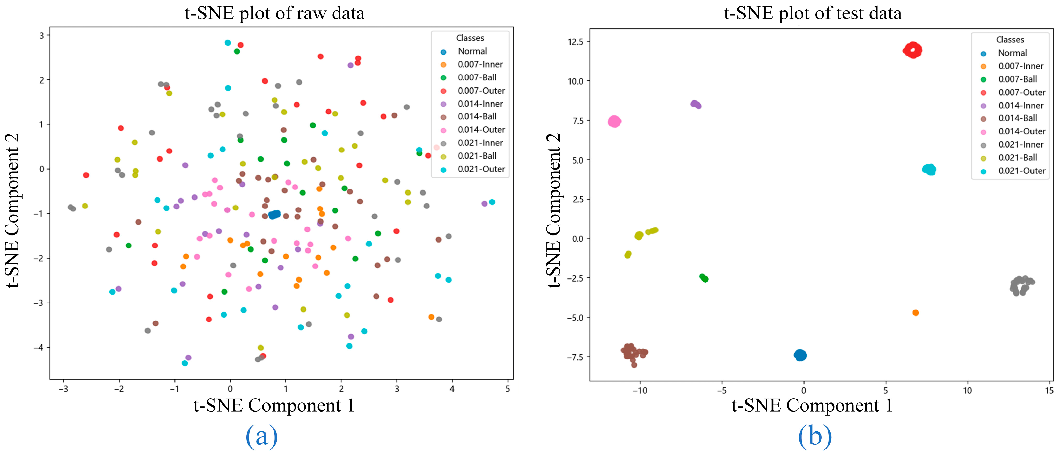 Figure 7a shows the t-SNE plot of the raw data, where partial overlap between fault categories is observed. This overlap suggests that the dataset contains non-trivial complexities, making it challenging to distinguish certain fault types through direct inspection. The lack of clear separation among clusters indicates that additional feature extraction or dimensionality reduction is essential to achieve accurate fault identification.