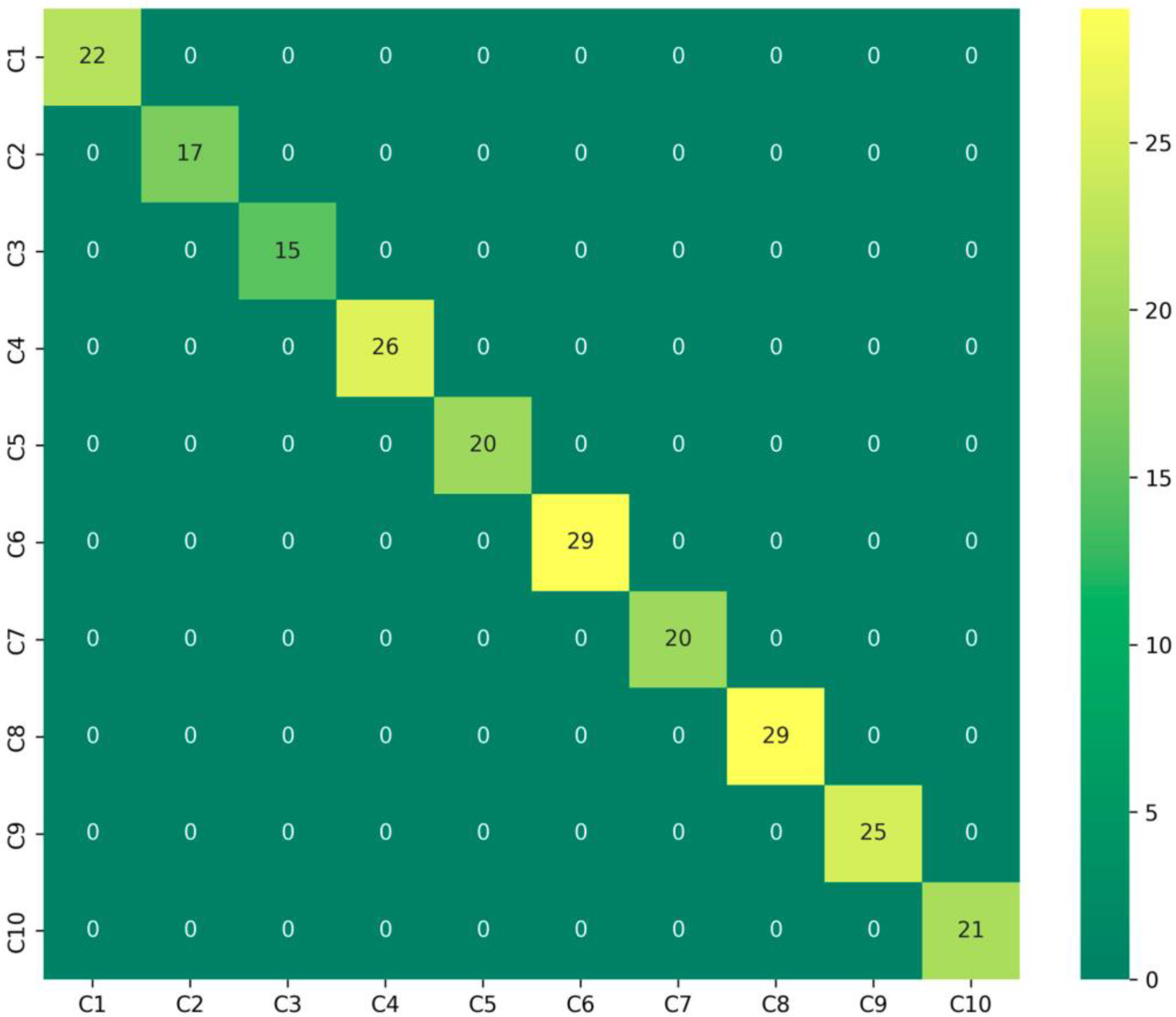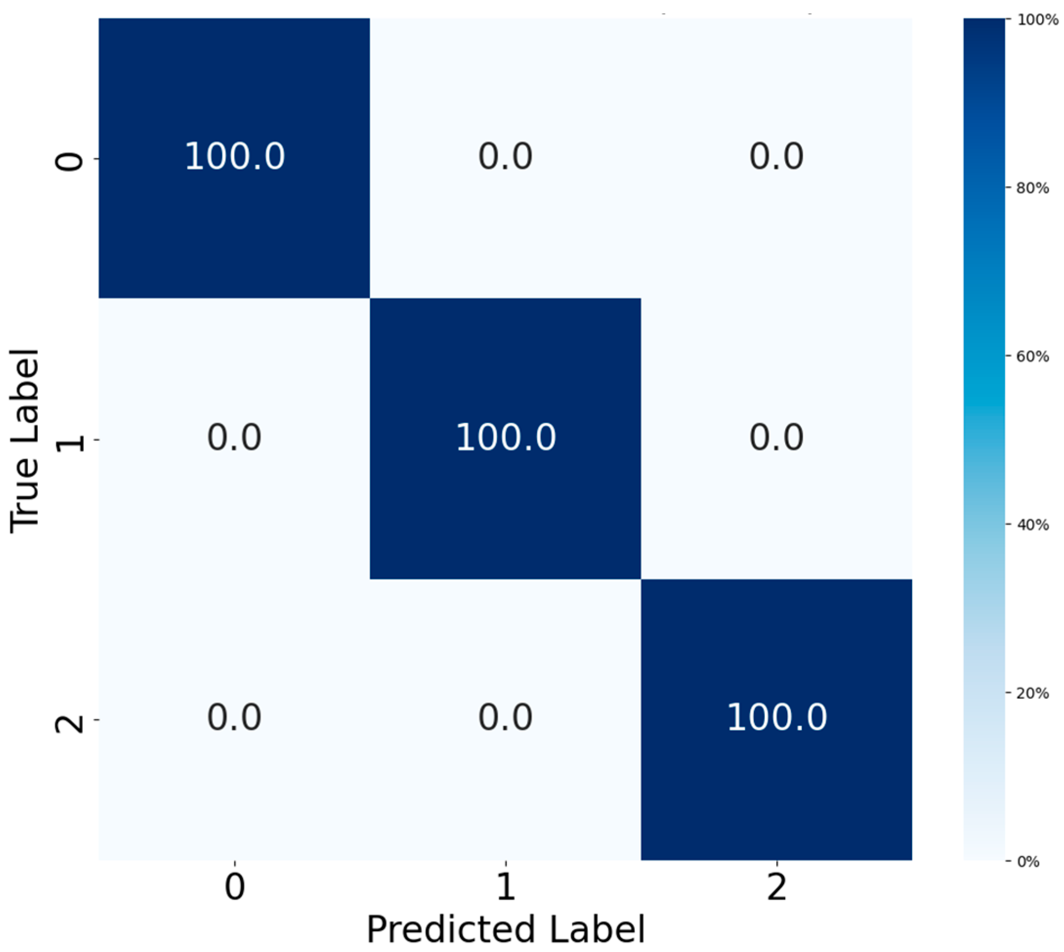 Figure 8) confirms a perfect classification outcome, with all test samples being correctly classified across every fault category. This validates the model’s comprehensive capability to handle diverse and complex fault patterns.