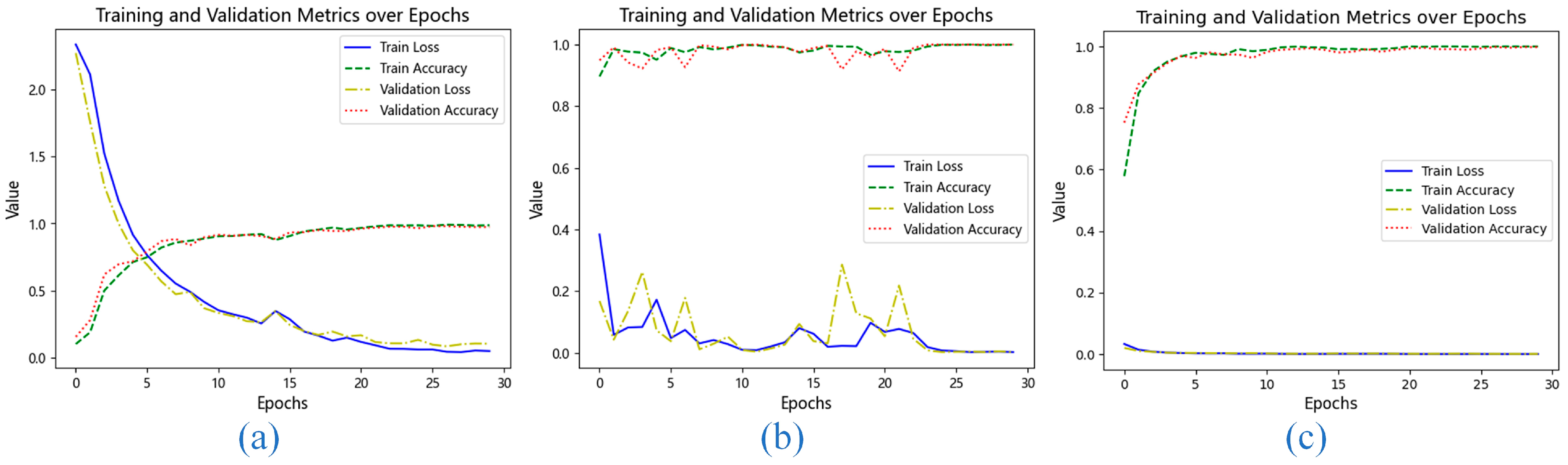 Figure 9c) resulted in a smooth and rapid decline in both training and validation loss, with accuracy stabilizing at a high level early in the training process. This demonstrates that the two preprocessing techniques are complementary: VMD provides fine-grained temporal decomposition, while FFT offers a global frequency perspective. Their integration creates a richer and more discriminative feature set, which is crucial for achieving high-precision fault diagnosis.
