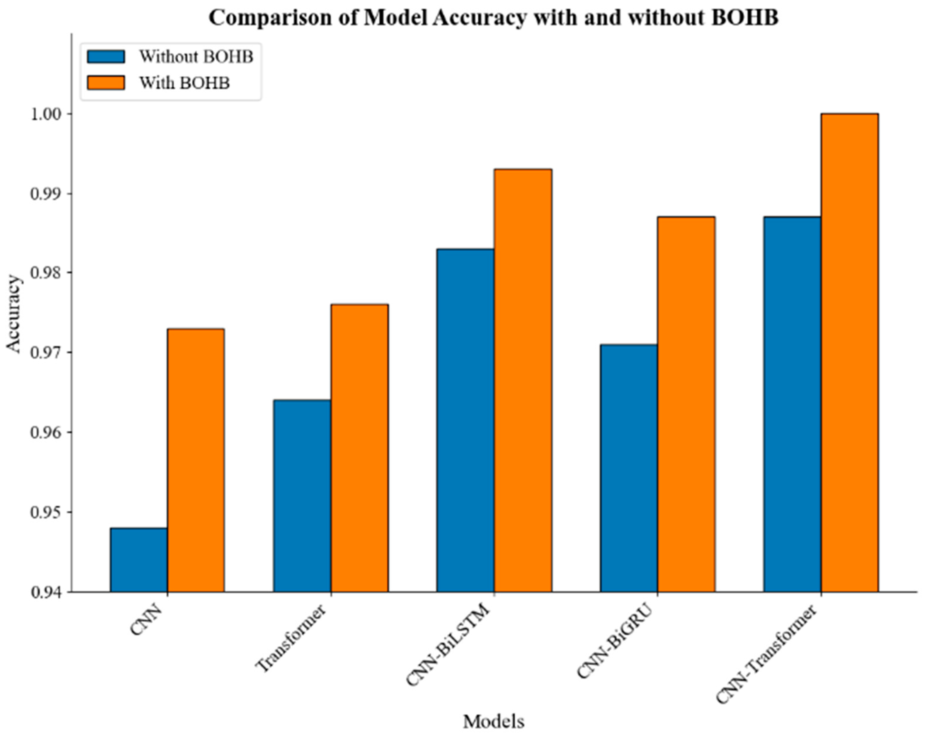 Figure 10, all models demonstrated substantial improvements in classification accuracy after BOHB optimization. As presented in the updated results, the CNN model achieved an enhanced accuracy of 97.3% ± 0.3%, reflecting more effective tuning of convolutional layers and learning schedules. The Transformer architecture attained 97.6% ± 0.3%, indicating refined attention head configuration and layer stacking. The CNN-BiLSTM model further strengthened its temporal modeling capacity, reaching 99.1% ± 0.2%, while the CNN-BiGRU model also showed marked improvement, achieving 98.7% ± 0.2%. Most notably, the proposed CNN–Transformer model attained a near-perfect accuracy of 99.91% ± 0.08%, significantly surpassing all baseline configurations and affirming the synergistic effect of its hybrid design when coupled with Bayesian hyperparameter optimization.