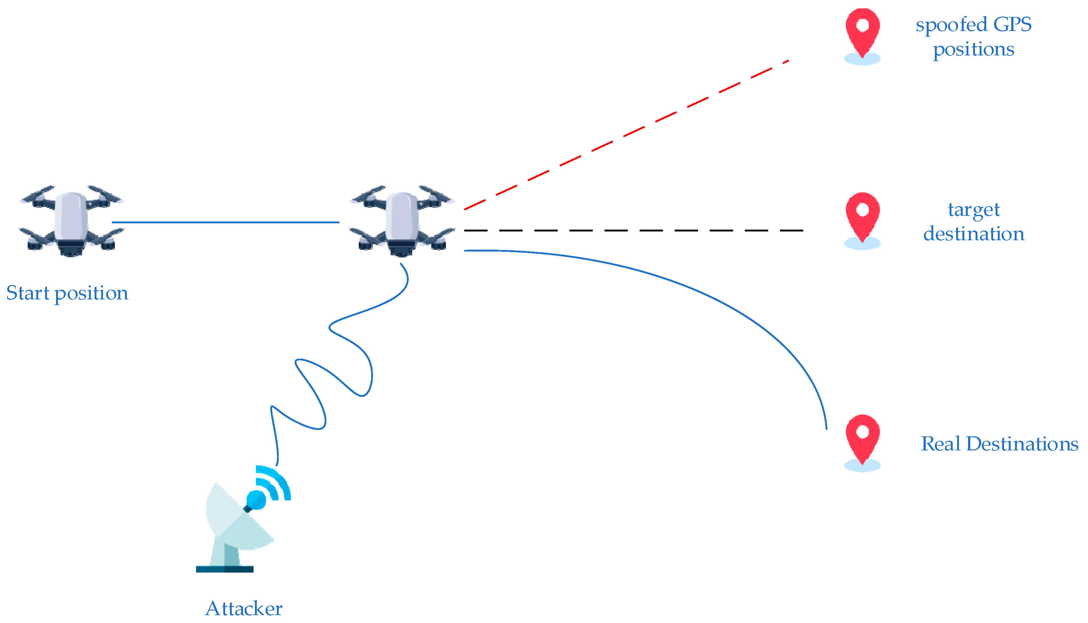 GPS spoofing is a type of attack in which falsified or manipulated navigation signals are broadcast to mislead UAVs into receiving erroneous positioning information. Attackers can influence the behavior of target UAVs without triggering system alarms, causing them to deviate from planned flight paths or even enter predefined restricted zones, thereby enabling behavioral interference or potential remote control. Such attacks are highly covert and directly effective, particularly when aimed at commercial or low cost UAV platforms, which often lack sophisticated spoofing countermeasures. Figure 1 presents a representative GPS spoofing attack scenario. In this illustration, a UAV departs from its initial location and navigates toward a designated target destination using standard GNSS signals. A ground based attacker then transmits counterfeit GPS signals with higher power, which override the legitimate satellite transmissions. As a result, the UAV locks onto the spoofed signals and is misled into following a false trajectory toward a spoofed location. This redirection may cause the UAV to enter restricted areas, fail its mission objectives, or even be exposed to hostile interception. The figure highlights the deceptive nature of GPS spoofing and the urgent need for effective detection and mitigation methods in real world UAV applications.