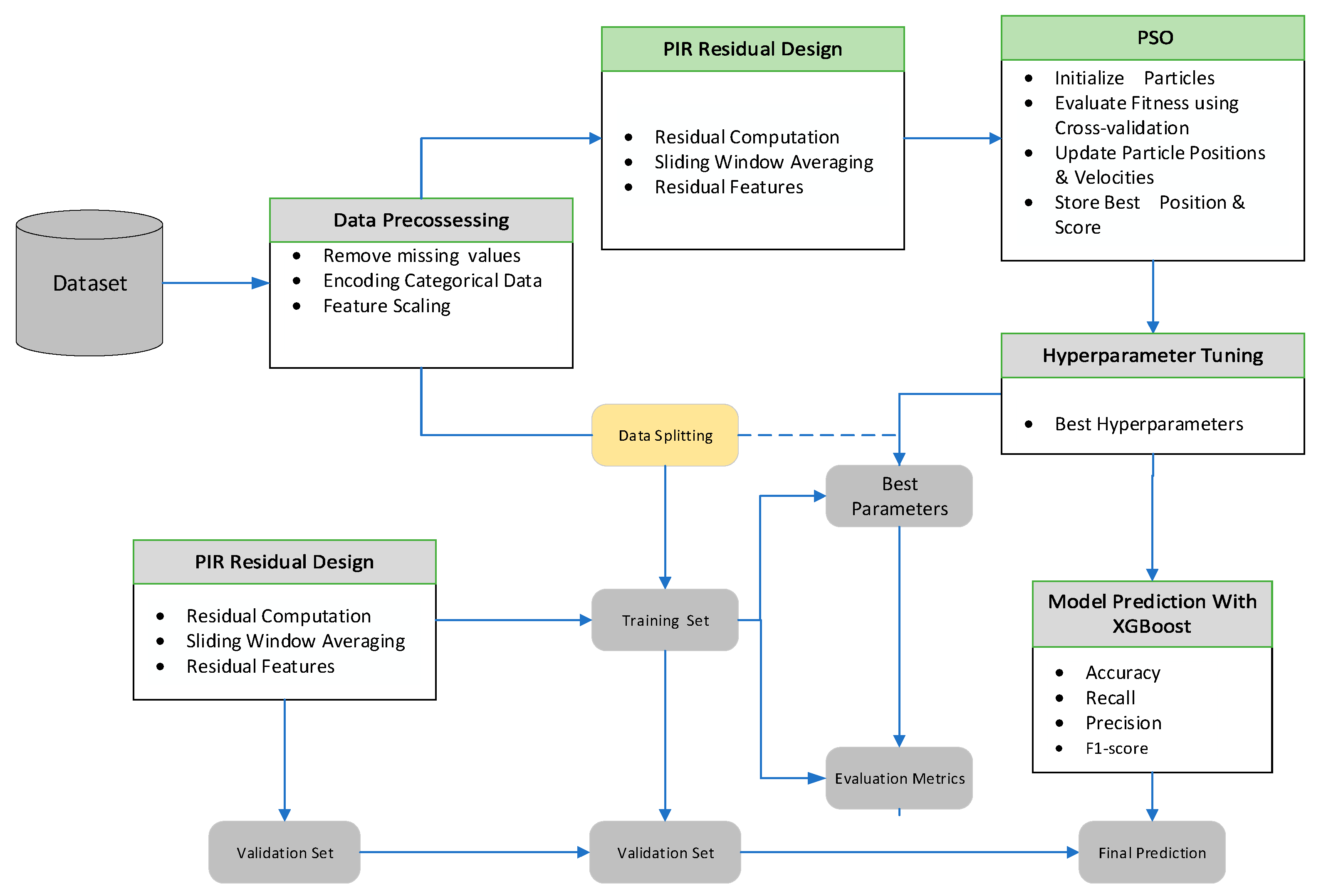 Figure 2. Overall architecture of the proposed GPS spoofing detection framework integrating Physics-Informed Residual feature construction and Particle Swarm Optimization-based hyperparameter tuning for an XGBoost-based classifier.