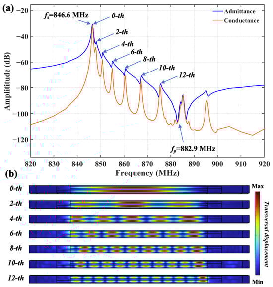 Figure 2a shows the calculated admittance and conductance (Y&G) of the conventional 128°Y-X LiNbO3 TC-SAW resonator in Figure 1, and it can be noticed that the transverse modes between fs and fp are obvious. Figure 2b shows the calculated transversal displacement distribution for transverse modes marked by arrows in Figure 2a, which unveils a transverse resonance mode caused by the lateral propagation of acoustic energy in the aperture region. It is worth noting that the displacement distribution in the transverse direction is not symmetric, which may be due to the anisotropy of the LiNbO3 material, a phenomenon that has previously been reported in SAW devices based on LiTaO3 [].