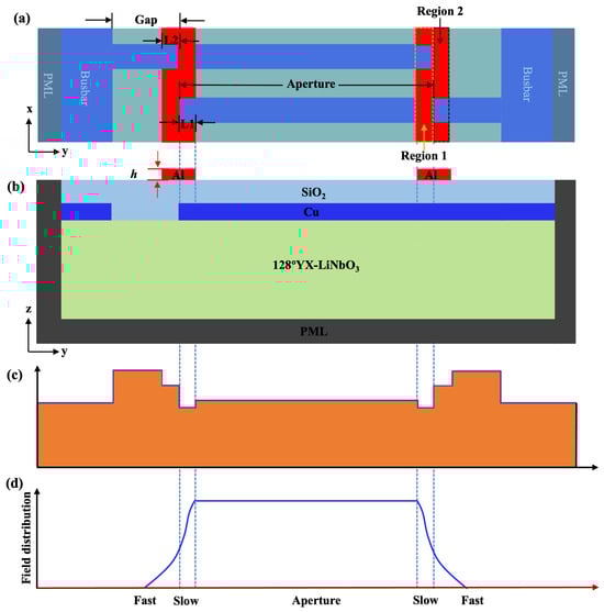 In accordance with the previously reported methods called piston mode [,], the introduction of the region with slower velocity at the edge of IDT electrodes (region 1) will change the distribution of the acoustic field from the excitation source throughout the active aperture region. The optimized acoustic field distribution shown in Figure 3d makes the overall vibration mode of the transducer closer to that of an ideal “piston”, where the entire surface moves with the same phase and amplitude. This “piston” mode of vibration preferentially and efficiently excites the main modes while suppressing the higher-order transverse modes that require non-uniform vibration to be generated []. It should be noted that the the piston mode will be effectively excited when the velocity and size of the slow region in the SAW resonator satisfy the Equations (1)–(2) [].