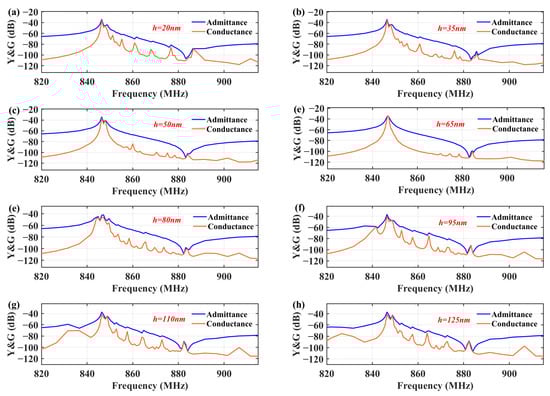Calculated admittance and conductance curves of TC-SAW resonator with bent metal strip on the top of SiO2 under different metal thicknesses. (a) 20 nm; (b) 35 nm; (c) 50 nm; (d) 65 nm; (e) 80 nm; (f) 95 nm; (g) 110 nm; (h) 125 nm.