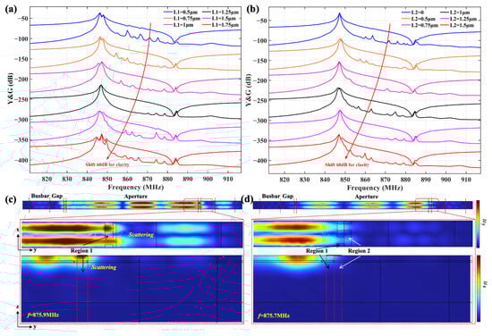 Figure 5b shows the variation in the calculated admittance and conductance curves with different lengths of L2 when h and L1 equal 65 nm and 1.25 m. The results show that, when the length of L2 is 0, i.e., the metal strips in region 2 do not exist, the transverse modes and spurious modes near the anti-resonance frequency are obvious. The mitigation of spurious modes gradually improves with an increase in the length of L2 and reaches the optimum at L2 = 1.25 m, and the above spurious modes are effectively mitigated. Then, the mechanism of the mitigation of spurious modes near the anti-resonance is analyzed by field analysis. Figure 5c,d show the calculated displacement distribution along the y and z directions of spurious modes corresponding to the frequency of 875.9 MHz at L2 = 0 and 875.7 MHz at L2 = 1.25 m in Figure 5b, respectively. Figure 5c shows that, when L2 = 0, the acoustic wave is reflected by the large velocity barrier, which results in a standing wave field in region 1 and energy scattering into the external gap region []. In contrast, the displacement distribution with the addition of the top metal strip in region 2 in Figure 5d shows the reduced energy scattering outside region 1, which can be attributed to a reduction in the velocity barrier between region 1 and the outside region. The reduction in scattering directly corresponds to the calculated curves in Figure 5b, which shows a significant mitigation of the intensity of the spurious mode near the anti-resonance. Based on the above analysis, the length of the external metal strip was determined as L2 = 1.25 m in this design.