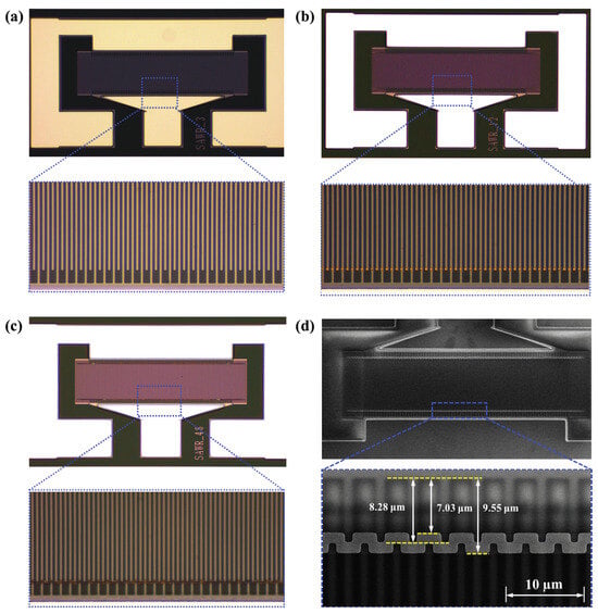 The optical microscope and SEM microscope images of the fabricated TC-SAW resonator according to the above fabrication process are shown in Figure 7. The optical microscope image in Figure 7a–c shows the overall structure of the fabricated TC-SAW resonator with three structures and the partially enlarged morphology of the edge of the IDT electrodes. The IDT electrodes are arranged regularly, with straight edges and excellent shapes, and there are no obvious defects or broken fingers. The SEM characterization results of the proposed TC-SAW resonator with bent metal strips on the top of the SiO2 layer in Figure 7d show that the metal strips are neatly deposited on top of the SiO2 with clear outlines. Measurements show that the length of the metal strips in the IDT aperture region, L1, is approximately 1.27 m, while the width of the gap region, L2, is approximately 1.25 m. All the structural parameters generally meet the optimal design parameters.