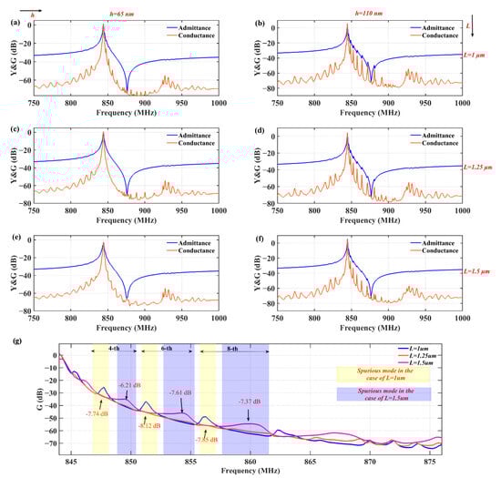 The measurement was executed with a ground-signal-ground (GSG) probe connected to a vector network analyzer. Before the formal test, the Short-Load-Open-Through (SLOT) calibration method was pre-adopted in order to exclude parasitic signal interference from equipment, RF cables, and adapters to ensure the accuracy and reliability of the test environment. Figure 8 shows the measured admittance versus conductance curves of the TC-SAW resonator with bent metal strips, which compares the response of the fabricated devices for different geometric parameters of metal strips. The left vertical plots (a), (c), and (e) correspond to the response curves at a top metal strip thickness of 65 nm, and the right vertical plots (b), (d), and (f) show the response curves at a top metal strip thickness of 110 nm. Meanwhile, the response curves of the top plots (a) and (b) and the middle plots (c) and (d), as well as the bottom plots (e) and (f), correspond to lengths of L1 and L2 equal to 1 m, 1.25 m, and 1.5 m, respectively. The measured results indicate that the transverse mode can be well suppressed at a thickness of 65nm. Figure 8g shows the effect of the metal strip’s length on the amplitudes of several spurious mode peaks (fourth, sixth, and eighth) when the thickness is 65 nm, and the comparison results show that the amplitudes at L = 1.25 m are significantly attenuated compared to in the other two cases. These results confirm that the transverse modes can be effectively suppressed in the TC-SAW resonator using these specific structural parameters (h = 65 nm and L = 1.25 m), which is consistent with the simulation results.