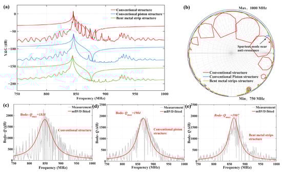 (a) The measured admittance and conductance responses of TC-SAW resonators of three different structures; (b) Smith chart; (c) quality factor of conventional structures; (d) quality factor of conventional piston structures; (e) quality factor of bent metal strip structure on top of SiO2 layer.