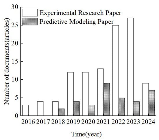 This paper categorizes the selected literature into two types: papers that conduct take-over experiments, analyzing the influencing factors of TOT and papers that establish TOT prediction models based on take-over experiments. As shown in Figure 2, from 2016 to 2018, the amount of literature on both categories was relatively small. After 2019, the number of experimental papers increased significantly, peaking in 2023 with 27 papers. The number of prediction model papers has shown a growing trend, but with a relatively smaller increase, averaging around 6 papers per year.