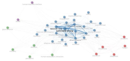 Figure 3 presents a keyword co-occurrence network generated using the bibliometrix package in R, which visually delineates the intellectual structure of the research field based on the 39 most frequent keywords. In the network, node size corresponds to keyword frequency, and the thickness of the connecting curves indicates the strength of co-occurrence between terms. Keyword clusters were identified using the Walktrap algorithm, which detects communities in the network based on short random walks. The most prominent feature of the map is a large, densely interconnected blue cluster positioned centrally, which unequivocally represents the core research theme. This cluster is anchored by the central and most frequent term ‘automated driving’, which exhibits the strongest linkages to pivotal concepts such as ‘take-over time’, ‘take-over request’, and ‘driver behavior’. The high frequency and tight cohesion of these keywords indicate that the primary research focus is concentrated on the dynamics of control transitions and driver performance within autonomous vehicles. Surrounding this central core, several smaller clusters in distinct colors represent specialized sub-themes that interact with the main research stream. The red cluster, grouping keywords like ‘distraction’, ‘drowsiness’, and ‘fatigue’, highlights the significant sub-topic of “Driver State and Impairment”. Adjacent to the core, the green cluster, encompassing ‘situation awareness’, ‘attention’, and ‘trust’, can be interpreted as the “Human Cognition and Reliability” theme. Other clusters, such as the one containing ‘human–machine interface’ and ‘tactile’, signify more niche research areas concerning interaction modalities. The structural centrality of the blue cluster, coupled with the radial distribution of secondary themes, effectively illustrates that investigations into vehicle control transitions form the foundational axis from which other specialized inquiries branch and connect.