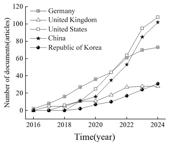 Figure 4 shows the dispersion of bibliography among the top 5 countries with the highest publication volumes. These statistics are based on the countries where the authors’ institutions are located. A single article may therefore have authors from different countries. The top three countries in terms of publication volume are the United States (108), China (102), and Germany (73), followed by Republic of Korea (31) and the United Kingdom (28). Both China and the United States have shown rapid growth in annual publication volumes in this field, while Germany and the United Kingdom have maintained stable publication quantities. These data indirectly reflect the continuous attention and proactive investment of China and the United States in research.