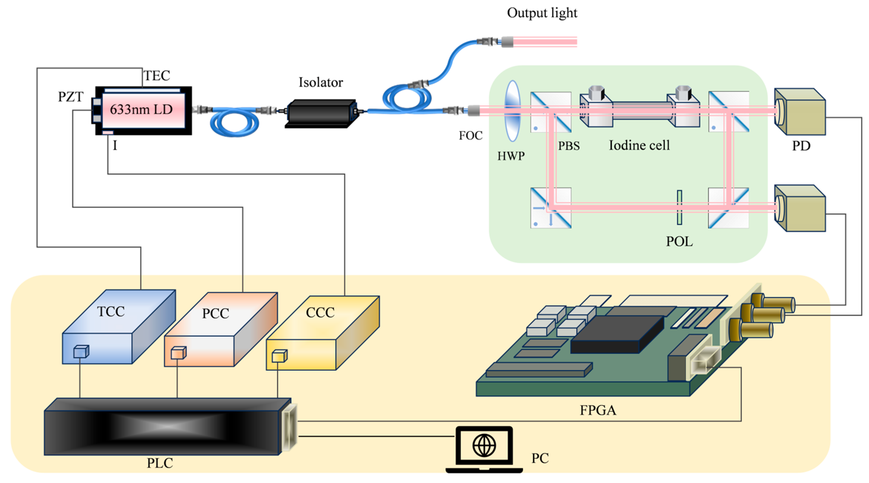 - Krause, F.; Sterr, U.; Benkler, E.; Noelleke, C.; Leisching, P. Iodine-Stabilized 633 nm Diode Lasers for Metrology and Interferometry. In Proceedings of the Conference on Lasers and Electro-Optics Europe/European Quantum Electronics Conference (CLEO/Europe-EQEC), Munich, Germany, 23–27 June 2019. [Google Scholar] [CrossRef]