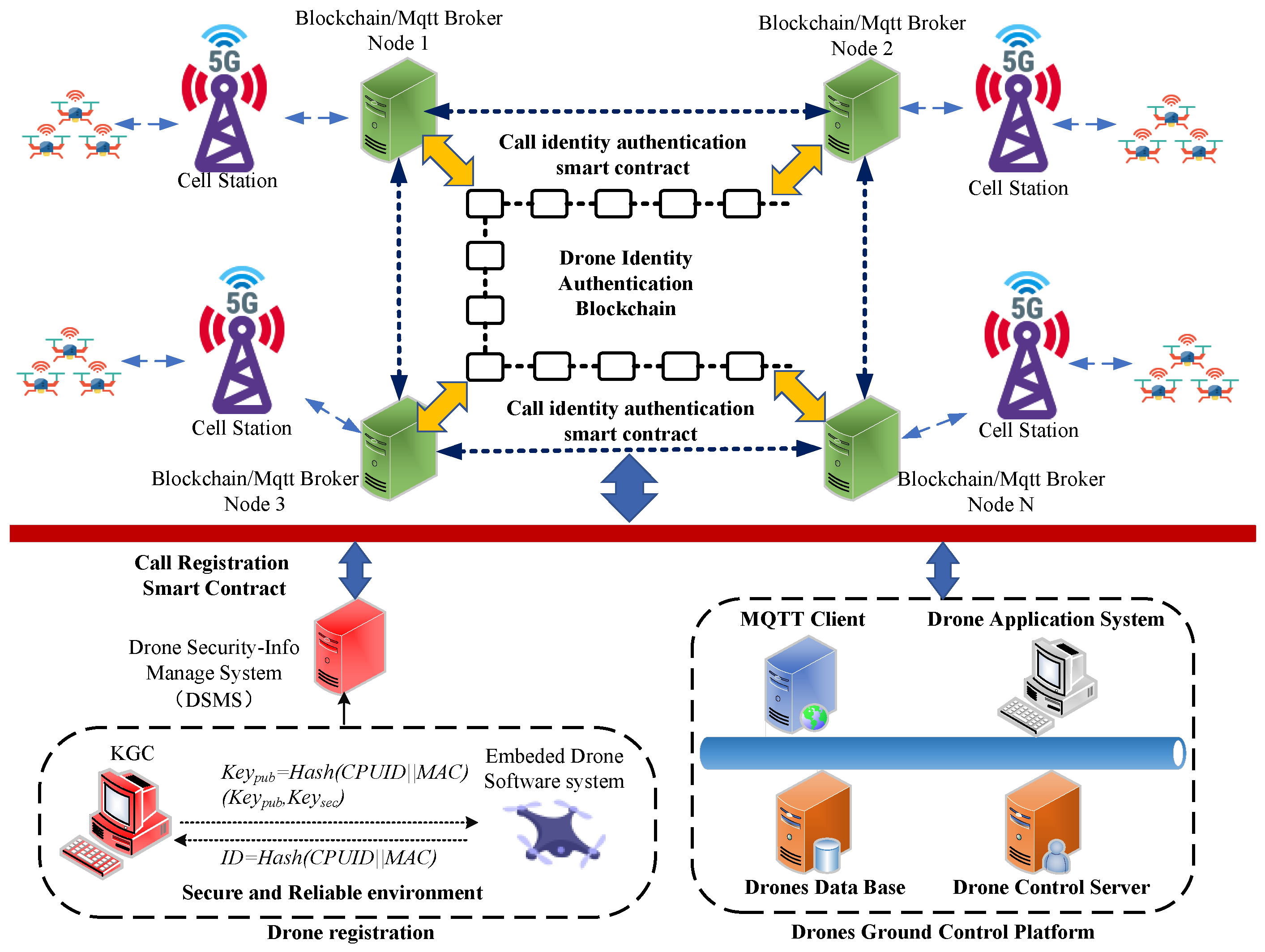In the blockchain system, to ensure the registered drones can perform identity authentication, key agreement, and encrypted communication through any blockchain node, each blockchian node is designed with an MQTT broker service. All MQTT brokers of the blockchain nodes form a Broker cluster. Thus, the drones ground control platform which provides various applications of drones, can communicate with drone connected with cellular network accessing any node of blockchain, after passing identity authentication and key agreement on the MQTT broker.