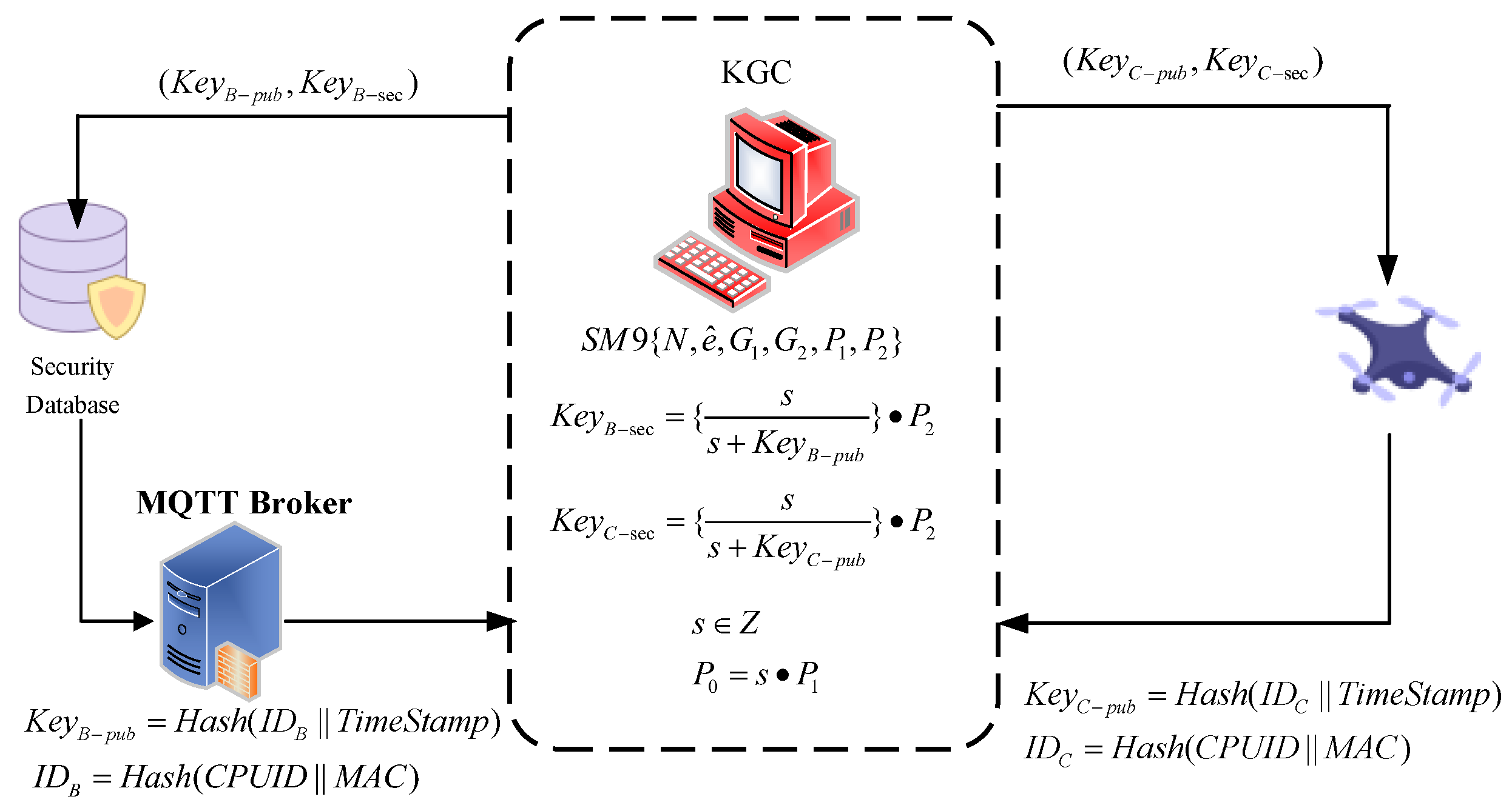 for the drone, and transmits this ID information securely to the KGC. The KGC then generates the drone’s public-private key pair