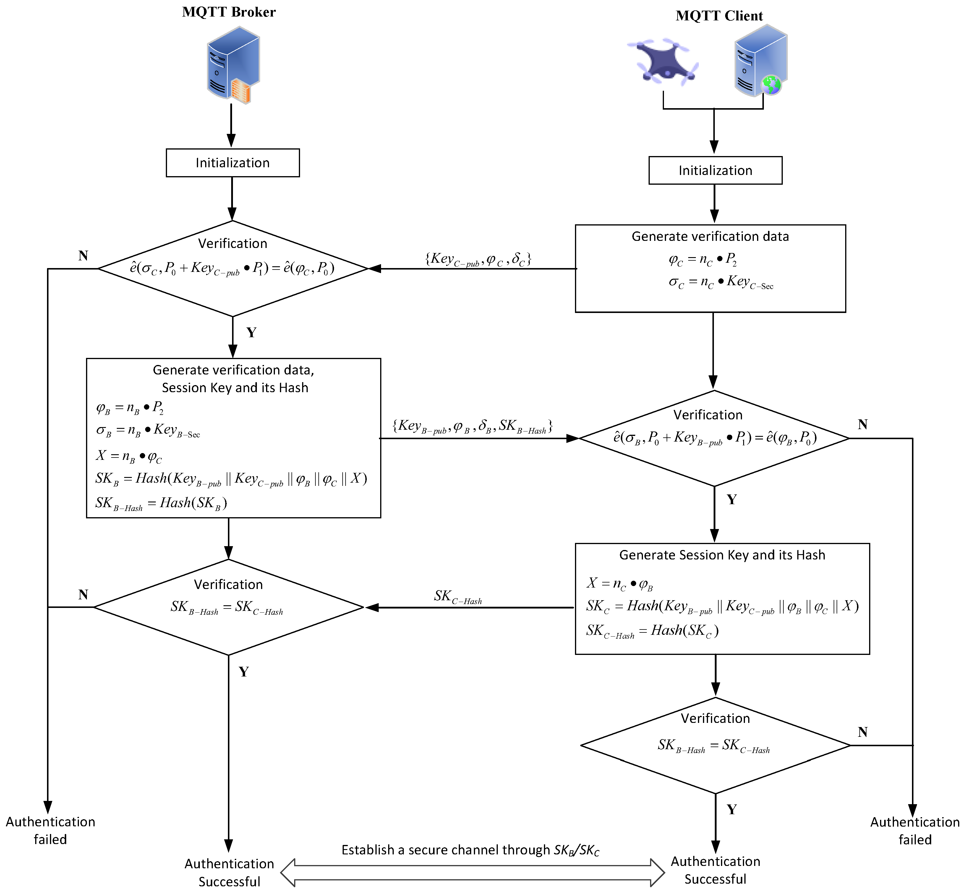 Step 2: Upon receiving the client’s authentication information, the GCS (MQTT Broker) performs a bilinear pairing check . If the check is successful, the server generates a random number and authentication messages , where and . Additionally, a session key and its hash value can be represented as , , . The server then sends the authentication messages and the session key hash value to the client. If the authentication fails, the process terminates.