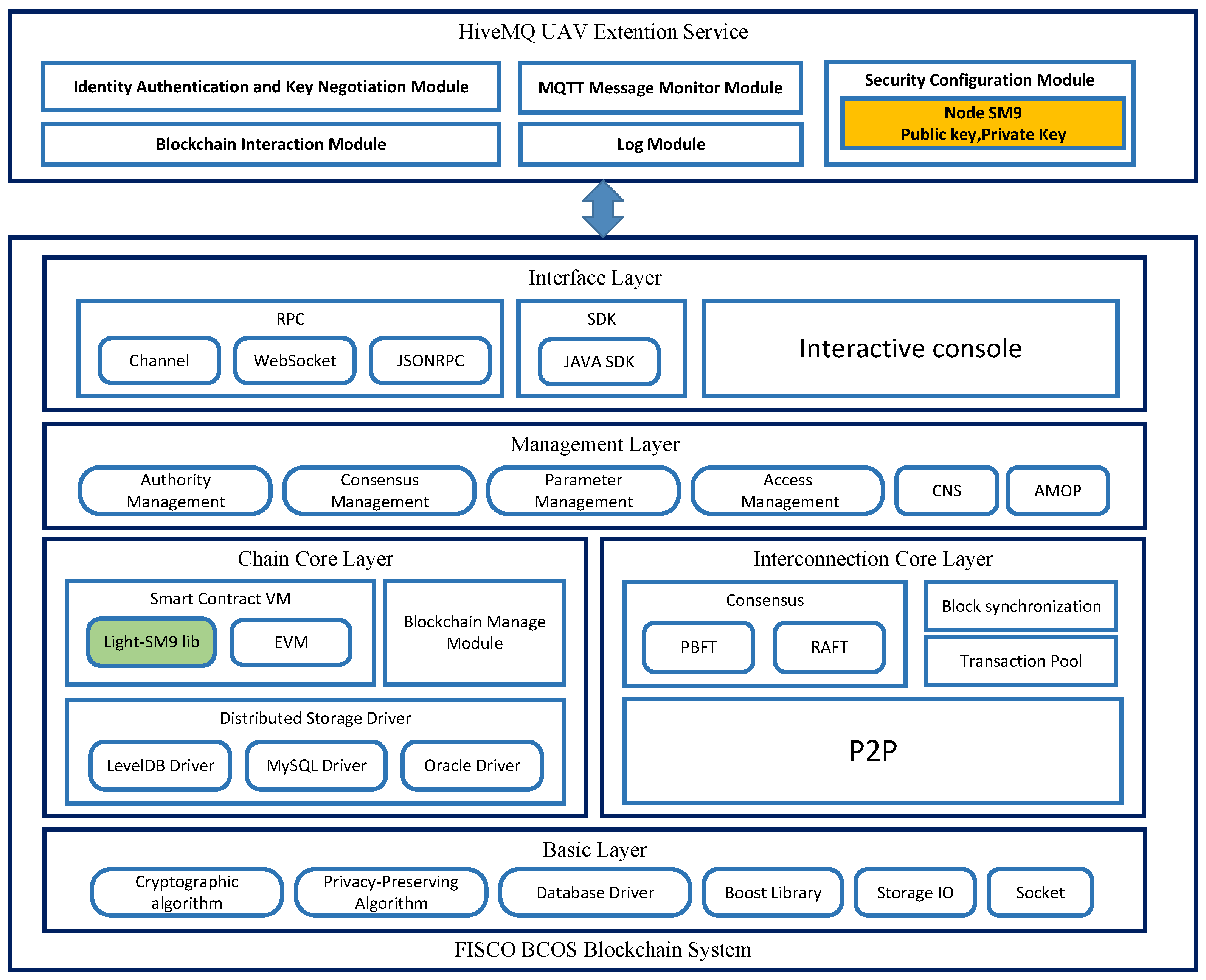 To implement the proposed scheme, the system integrates the Light-SM9 algorithm’s C language library into the Chain Core Layer, providing interfaces for both the MQTT UAV Extension service and the EVM (Ethereum Virtual Machine), significantly enhancing the efficiency of authentication and key negotiation processes.