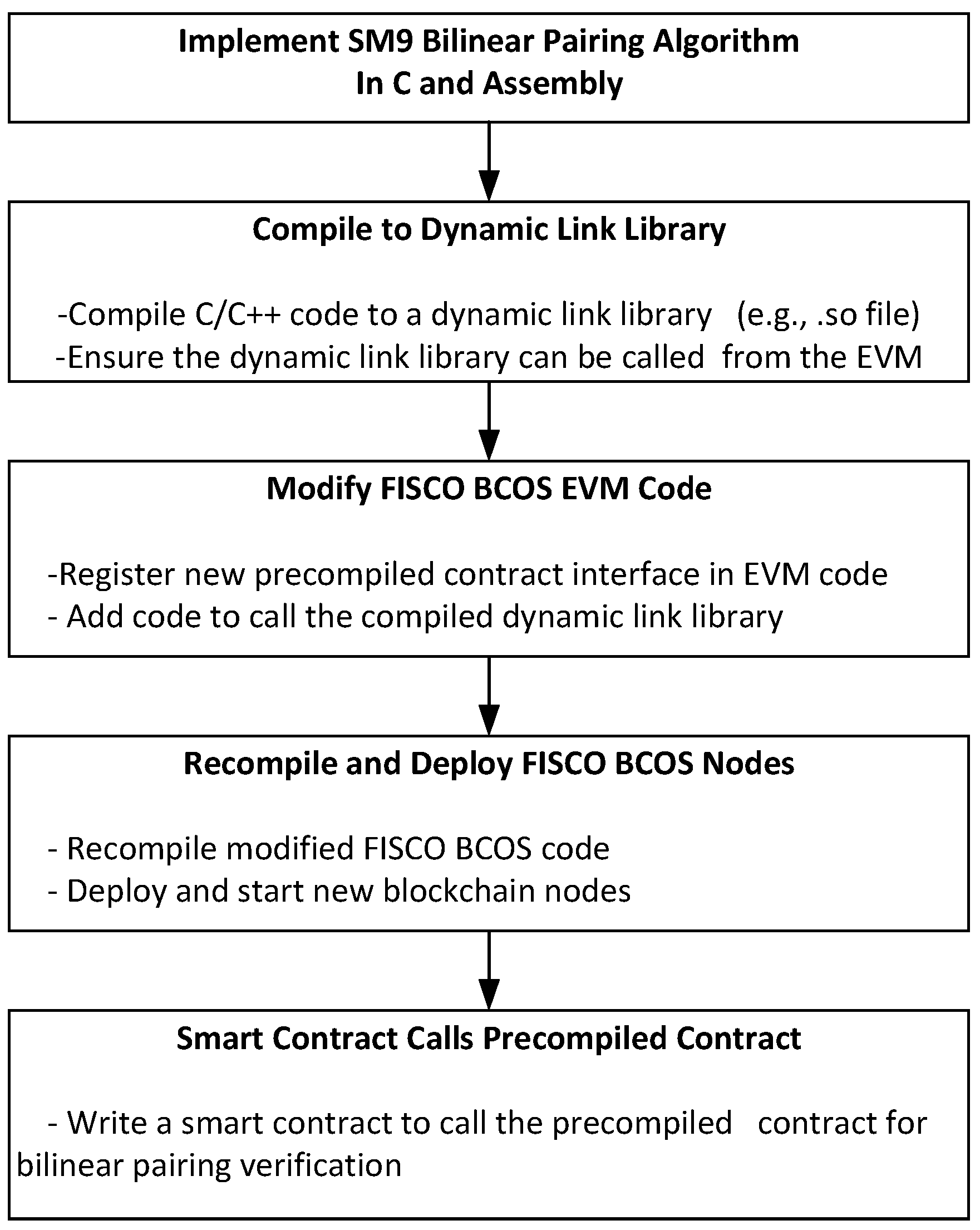 Figure 6, the steps to implement the bilinear pairing precompiled contract are outlined as follows. Firstly, the bilinear pairing operation is implemented using C language and assembly to ensure high computational performance. Secondly, this implementation is compiled into a dynamic link library (e.g., a .so file). Then, a new precompiled contract interface (address(0×12)) is registered within the FISCO BCOS EVM code, enabling it to invoke the bilinear pairing operation from the dynamic link library. Secondly, the FISCO BCOS node, including the precompiled contract, is recompiled and deployed to ensure it can correctly load and call the new precompiled contract. Lastly, smart contracts are written to call the precompiled contract for bilinear pairing verification, facilitating efficient identity authentication or other cryptographic operations. Through these steps, the bilinear pairing operation can be efficiently and securely implemented within the EVM, improving the execution efficiency and security of the blockchain system. The final bilinear precompiled contract, as depicted, allows other smart contracts to invoke the verify function within the