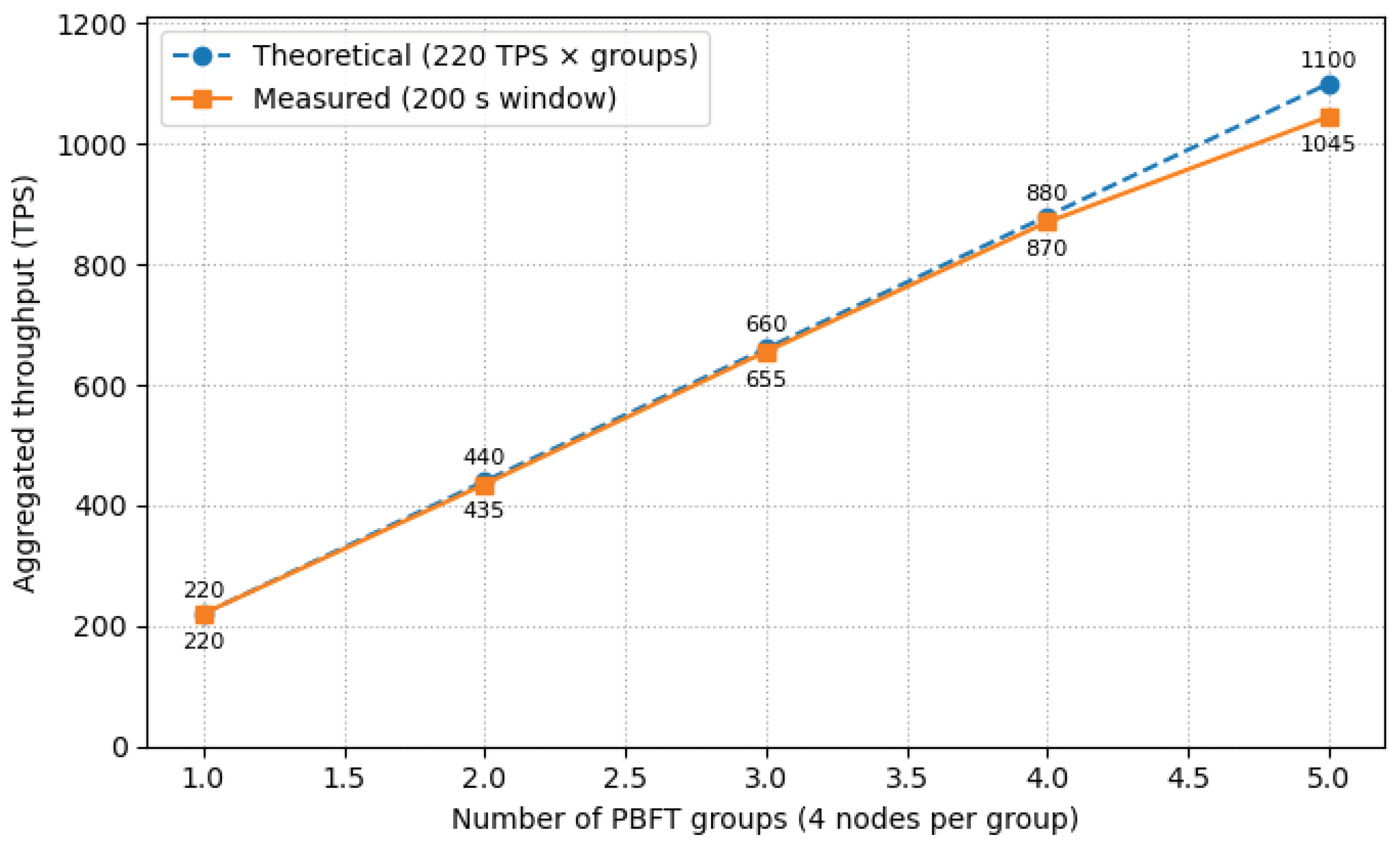 This experiment was designed to validate the effectiveness of the multi-group parallel architecture in enhancing the overall system throughput. We deployed a total of 20 nodes on the same physical cluster, partitioned into 5 independent 4 node PBFT consensus groups. Each group maintains a separate ledger and executes smart contracts independently. By incrementally increasing the number of active parallel groups from one to five, we measured and compared the aggregated transaction throughput (TPS) to assess the system’s horizontal scalability.