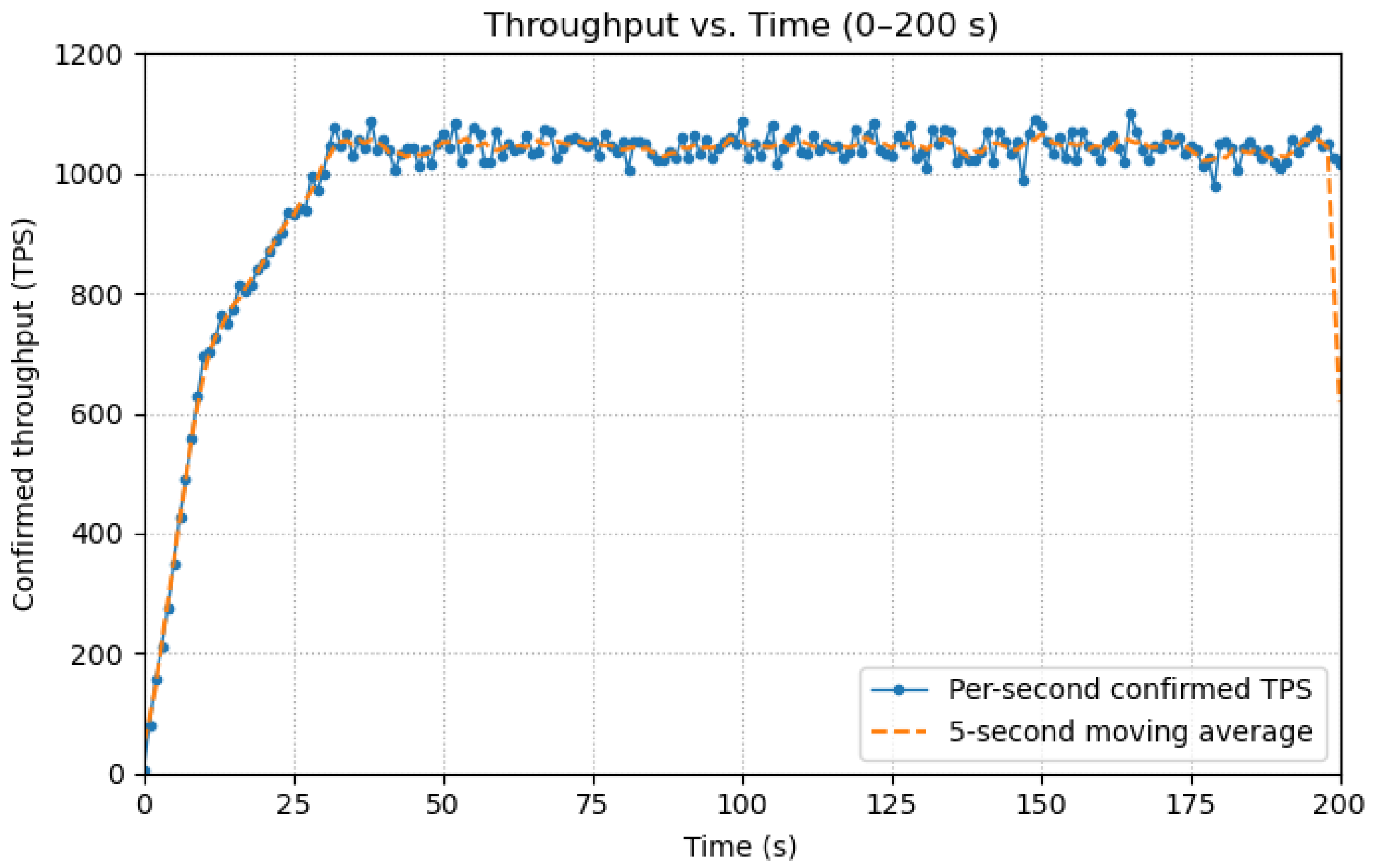 t = 30 s onward, the system operates at a steady state around 1045 TPS, with minor oscillations due to 1s block sealing and routine retransmissions. This profile confirms that our reported capacity numbers are not momentary spikes but sustained plateaus once the system is warmed up.