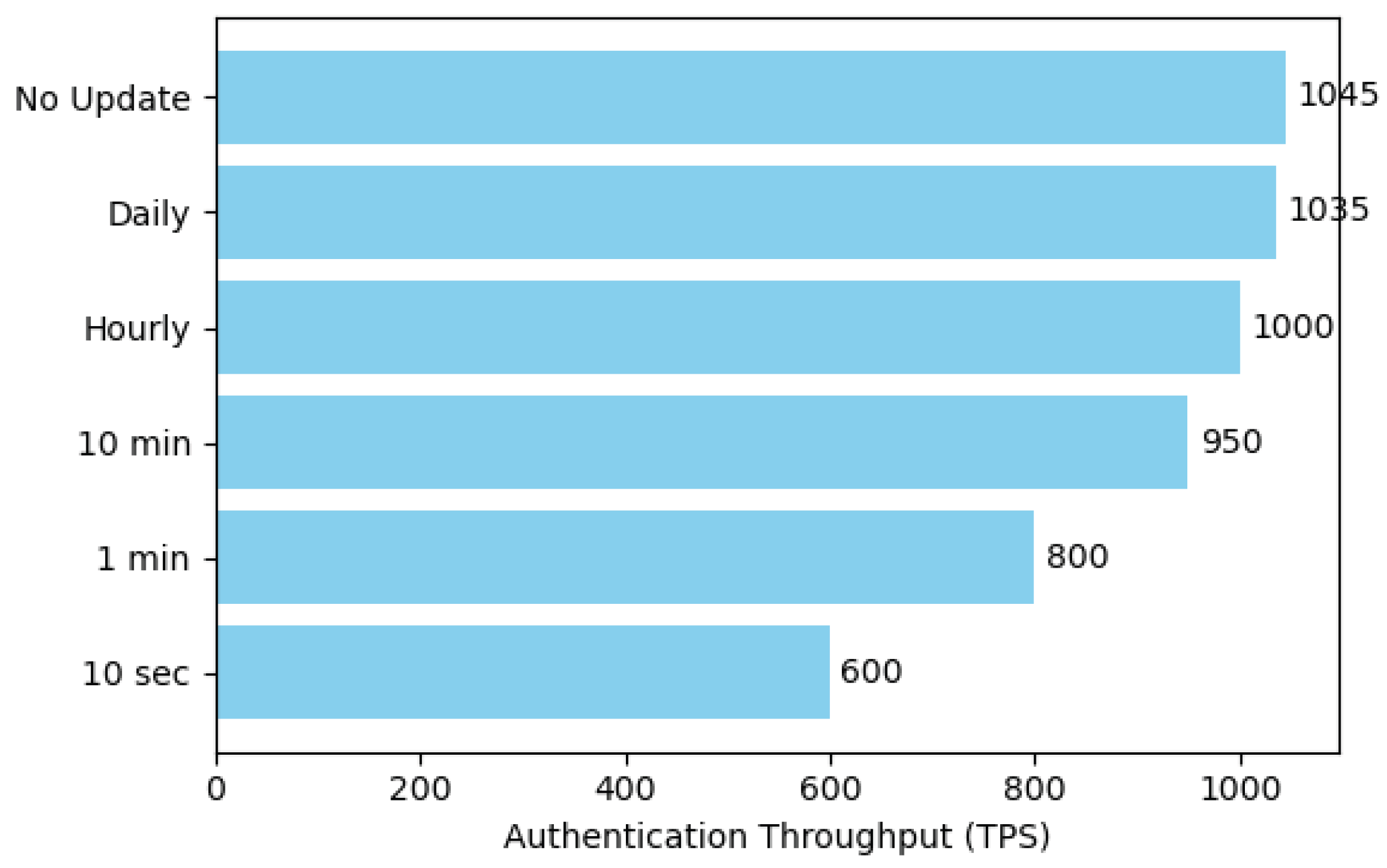 Figure 11, we configured several update frequencies, ranging from no updates to high-frequency updates, including “No Update,” “Daily,” “Hourly,” “10 min,” “1 min,” and “10 sec.” For each frequency setting, we measured the maximum sustained authentication throughput (TPS) the system could maintain. We hypothesized that a higher update frequency would consume more computational and on-chain consensus resources, thereby increasingly impacting the normal authentication processing capacity.
