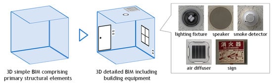 The proper use of the Building Information Model (BIM) throughout a building’s lifecycle can result in substantial cost savings for facility managers and owners. However, as 3D models are typically unavailable for existing or older buildings, the BIM is often generated from 3D scanned point clouds. Over the past decade, significant research and development efforts have focused on the automatic generation of BIM from such point clouds. As a result, it is now feasible to automatically construct basic BIMs comprising primary structural elements such as floors, walls, ceilings, and columns [1,2,3]. However, as illustrated in Figure 1, the automatic generation of detailed BIMs which include, for example, electrical equipment such as lights, speakers, and switches, and safety equipment such as evacuation signs, fire alarms, and sprinklers essential for maintenance and facility management remains an unsolved problem. In the field of safety and disaster prevention, detailed BIMs that integrate electrical and safety equipment can support risk assessment of fire, power outage, or structural hazards and can be directly utilized for evacuation planning and disaster-response simulations. In terms of facility operation and maintenance, such enriched BIMs facilitate the scheduling of equipment inspections, the planning of replacements or upgrades, and the management of lifecycle costs, thereby improving both operational efficiency and long-term reliability. However, these components are typically attached to ceilings or walls and are characterized by small surface areas and minimal thickness. As such, they are difficult to detect based solely on geometric features of the point cloud [4]. To address this limitation, it is necessary to develop methods that utilize non-geometric information for the detection of such building equipment, thereby enabling the integration of these elements into basic BIMs and facilitating the generation of detailed BIMs.