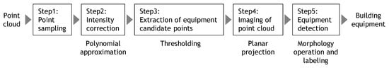 An overview of the proposed method is shown in Figure 2. In this method, the target region is first manually extracted, and preprocessing is applied to sample the point cloud so that the point density becomes spatially uniform. Subsequently, the effects of distance and incident angle on the reflection intensity are corrected using polynomial approximation, and the reflection intensity values of walls and ceilings composed of the same material are adjusted to approximate a constant value. Next, assuming that the corrected reflection intensity follows a normal distribution, points that significantly deviate from this distribution are identified as equipment candidates through a thresholding process. The point cloud is then converted into a binary image, and individual equipment components are extracted using morphological operations and connected-component labeling. In this study, we focus on regions scanned under conditions where the distance between the scanner and the target surface is kept constant. Further methodological details are provided in the following sections.